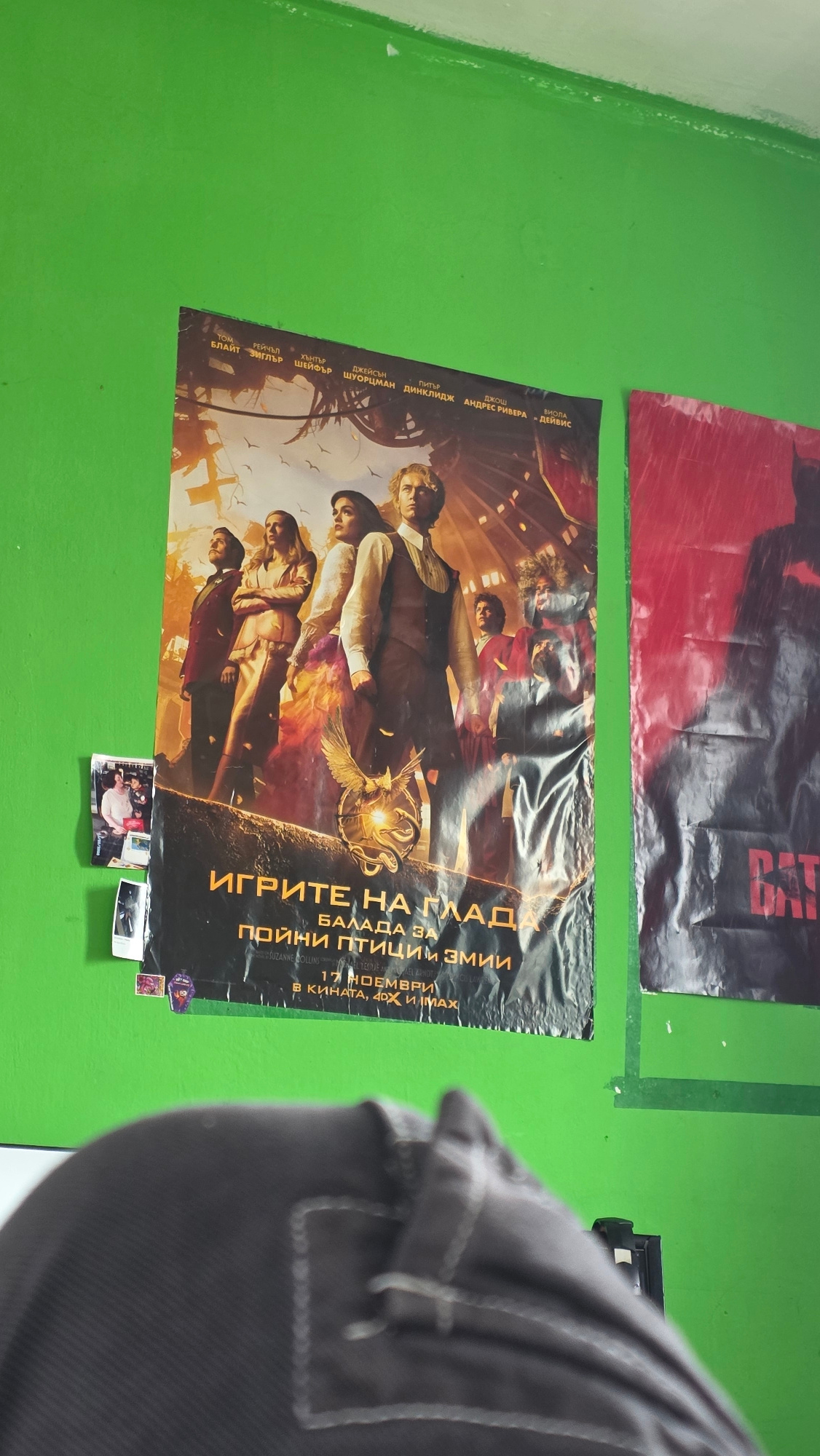An indoor scene in Kazichene, Bulgaria, features a vibrant green wall adorned with two movie posters and other small items. On the right, the shoulder and back of a person, dressed in a dark grey garm…read more