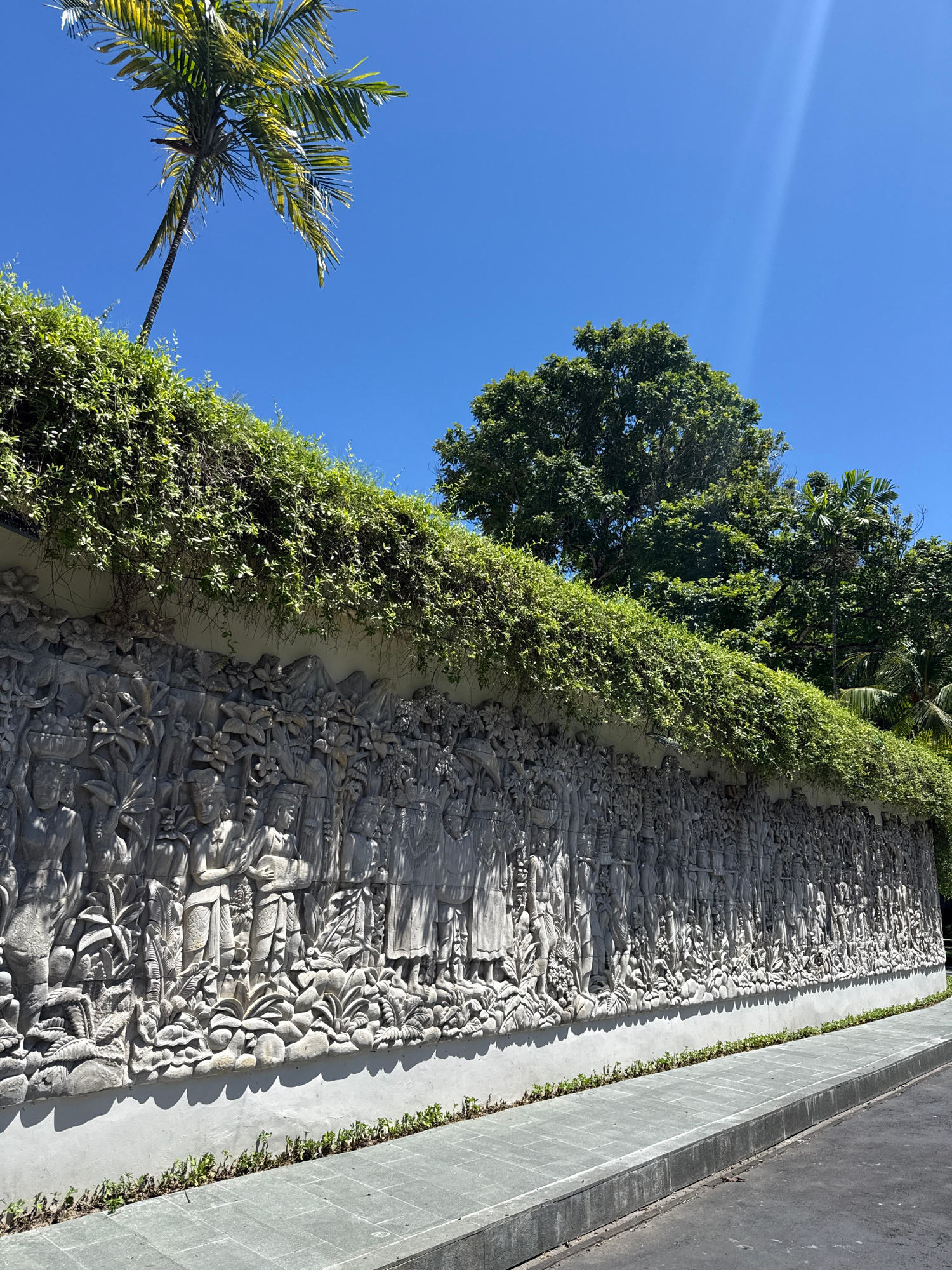 The image depicts a detailed stone carving wall in Nusa Dua, Indonesia. The wall features a complex relief depicting figures, plants, and scenes of daily life, partially obscured by a line of greenery…read more