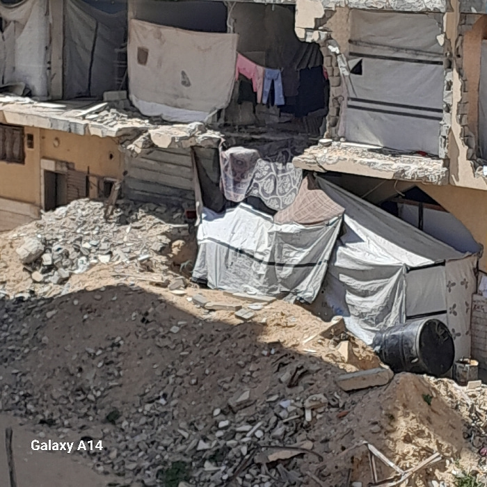 The image displays a scene in Khan Yunis, Palestinian Territory, showing an area with significant structural damage and improvised living structures under clear daylight conditions. In the background,…read more