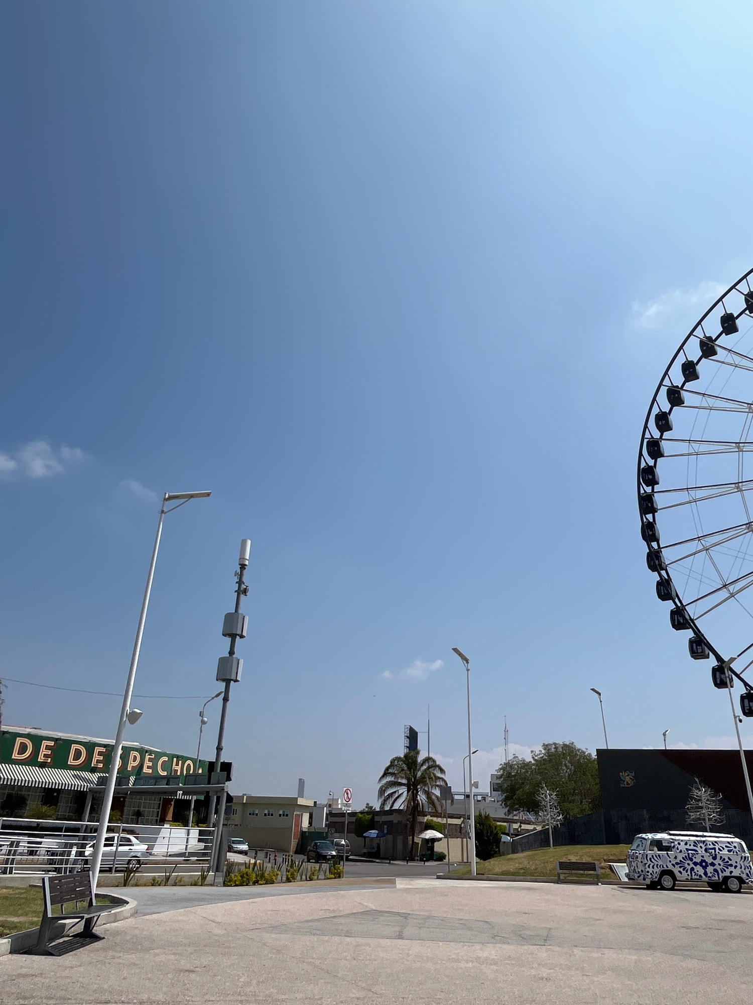The image shows a Ferris wheel partially visible at the top, against a bright blue sky with some scattered clouds. Below, a street scene is present, featuring a tall sign that says "DE DE DESPECHO". S…read more