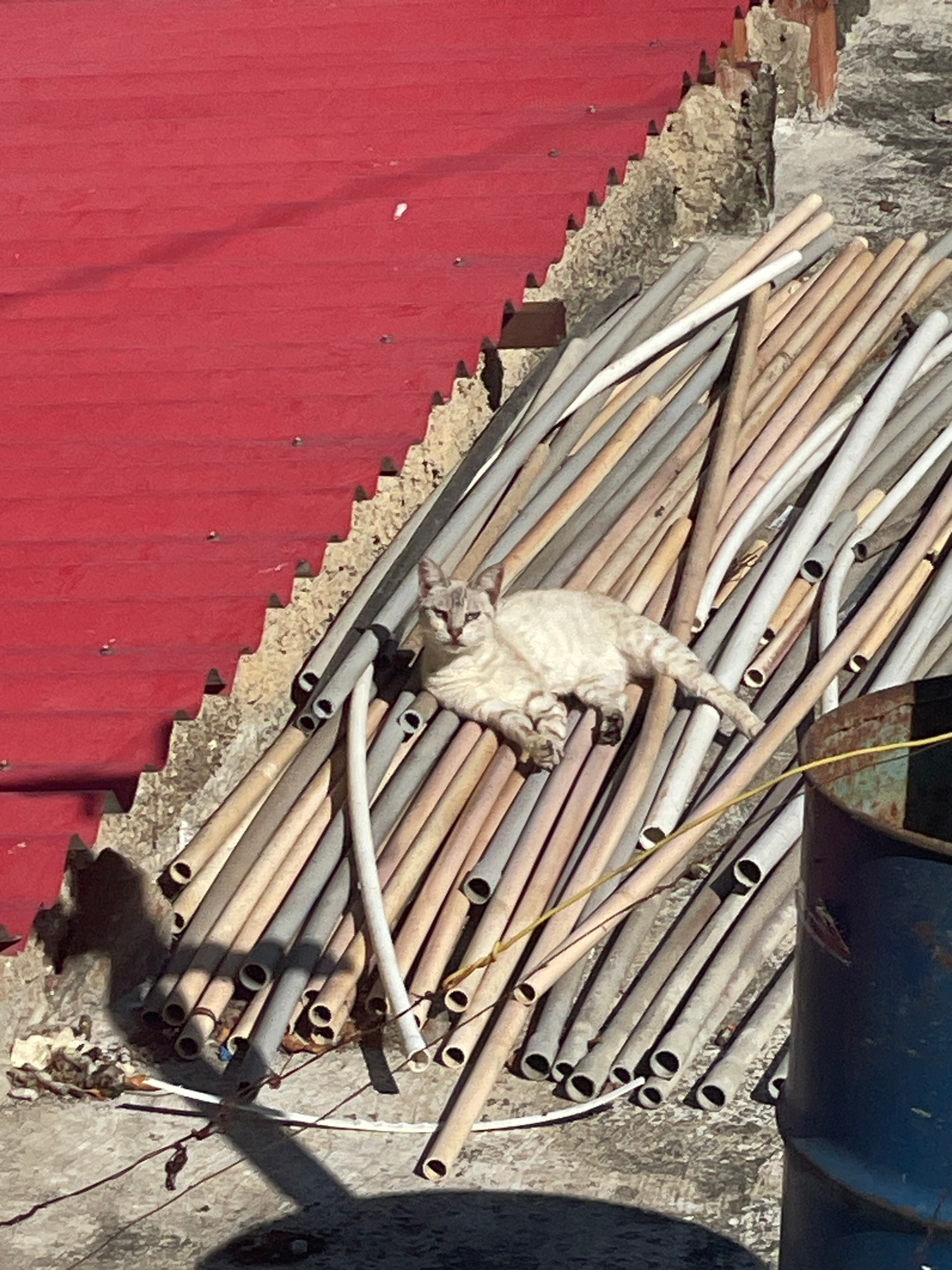 A cat is sprawled among stacked gray and tan pipes, with a red corrugated metal wall on the left side of the frame. The pipes are arranged haphazardly and cast shadows across the concrete surface. A p…read more