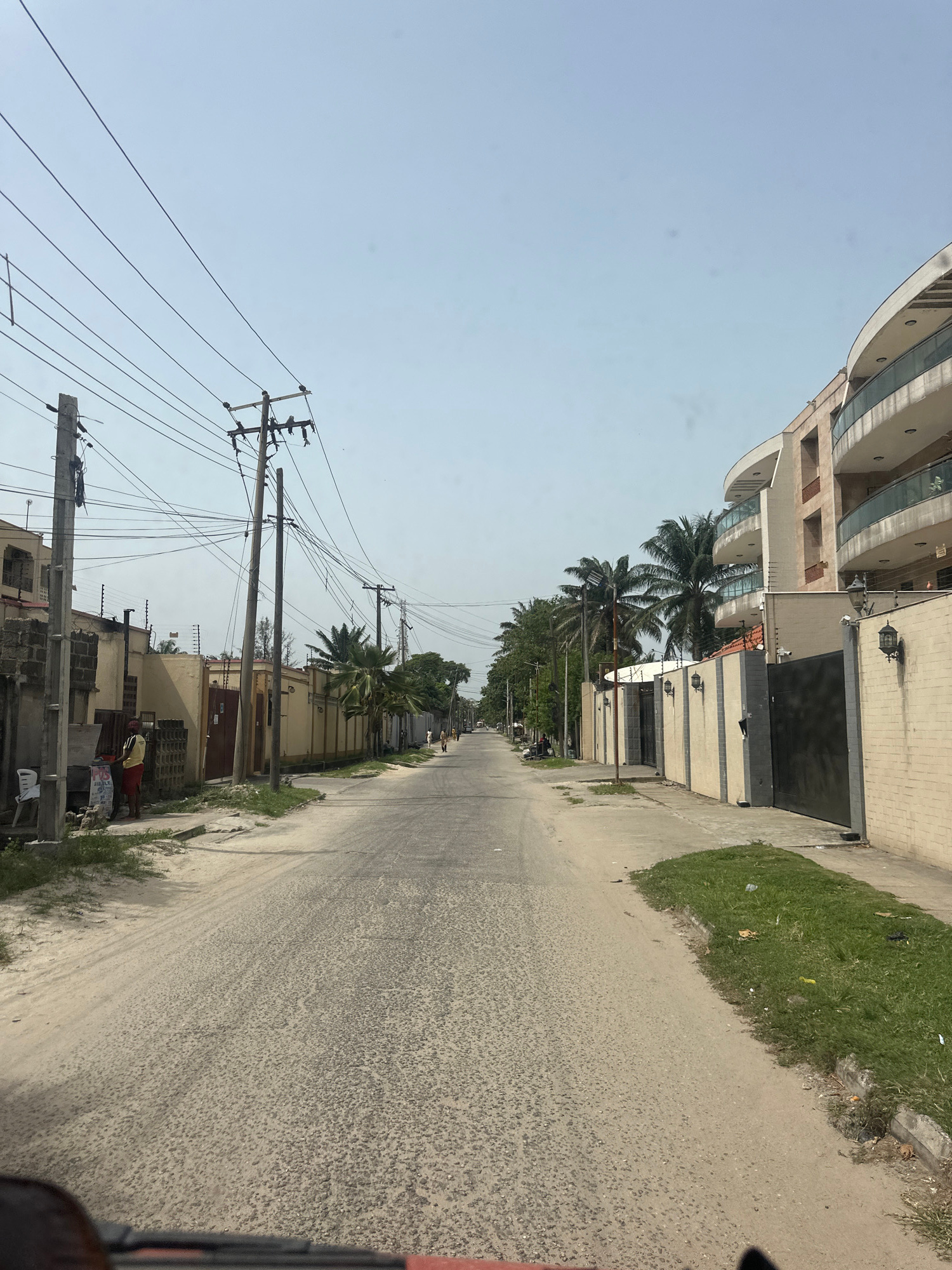 The image depicts a street scene in Lagos, Nigeria, characterized by a narrow road lined with buildings of varying sizes and architectural styles. The road surface appears to be concrete or asphalt, s…read more