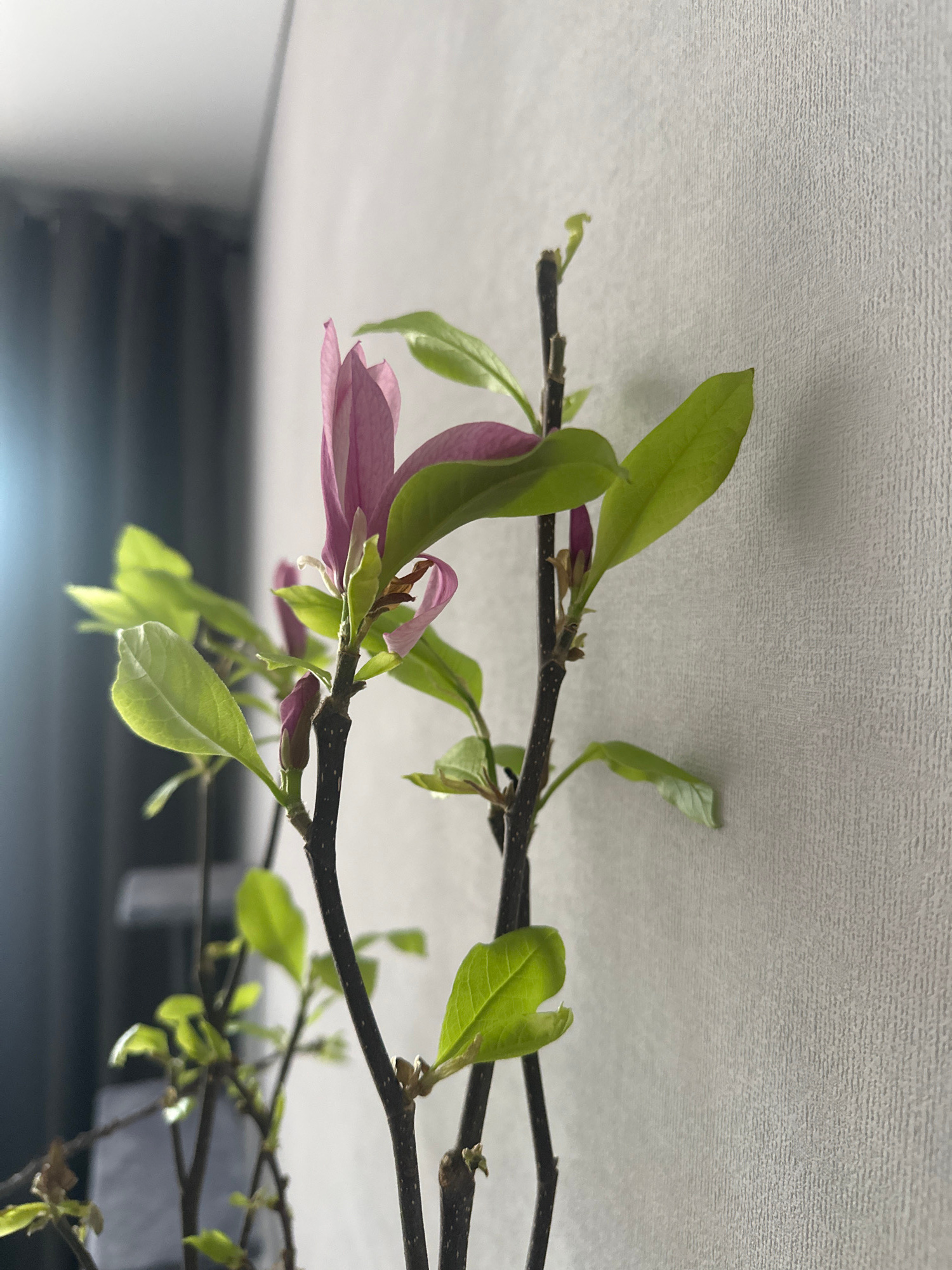 A low-angle close-up shot reveals a branch, possibly from a magnolia tree, featuring a pink flower and numerous green leaves, set against a white ceiling. The dark brown branch is punctuated by lighte…read more