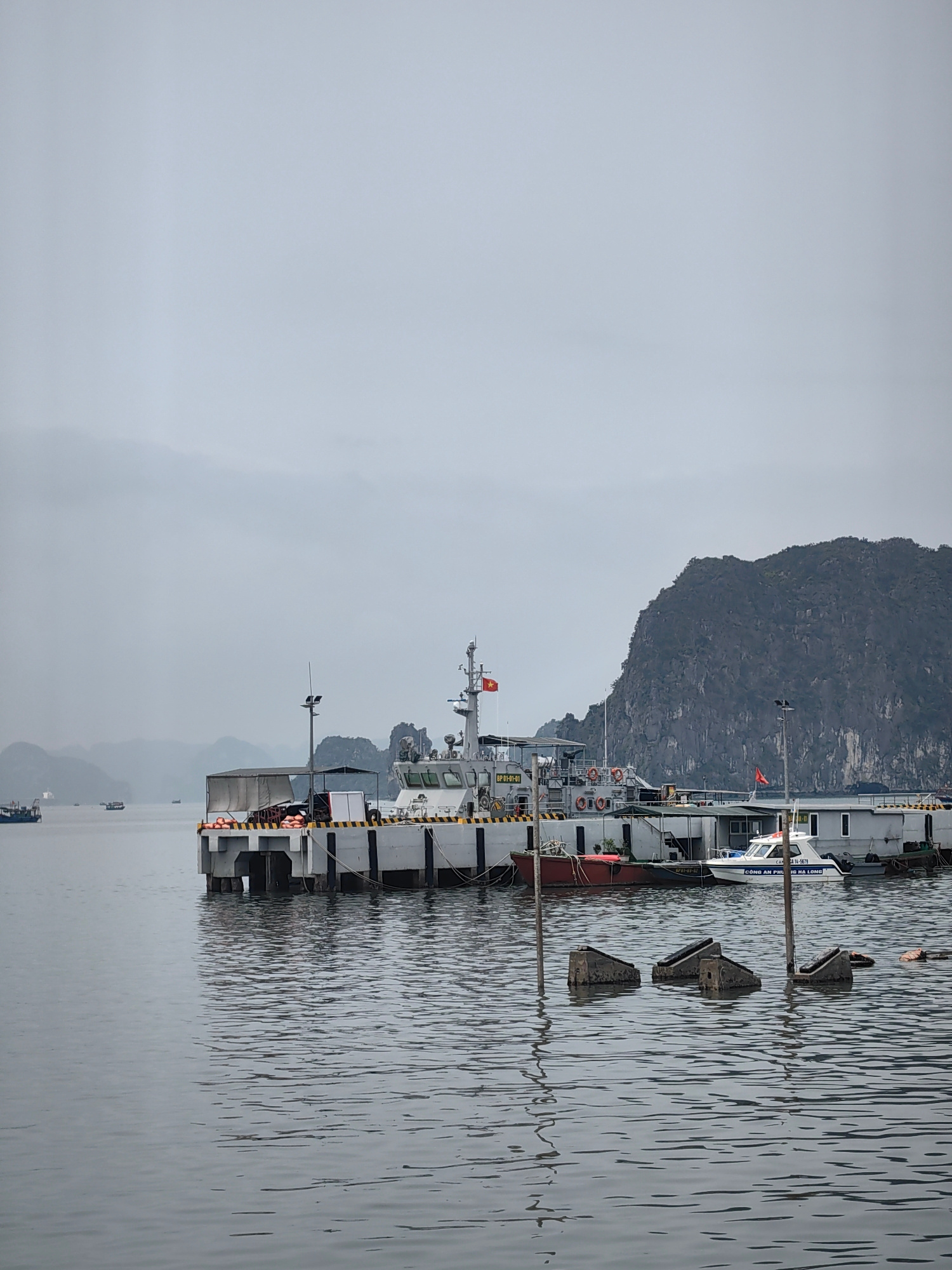 This image depicts an overcast day in a tranquil harbor or bay, with distinct limestone karsts in the background, characteristic of Ha Long Ward, Vietnam. The scene is calm, with no people visible. I…read more