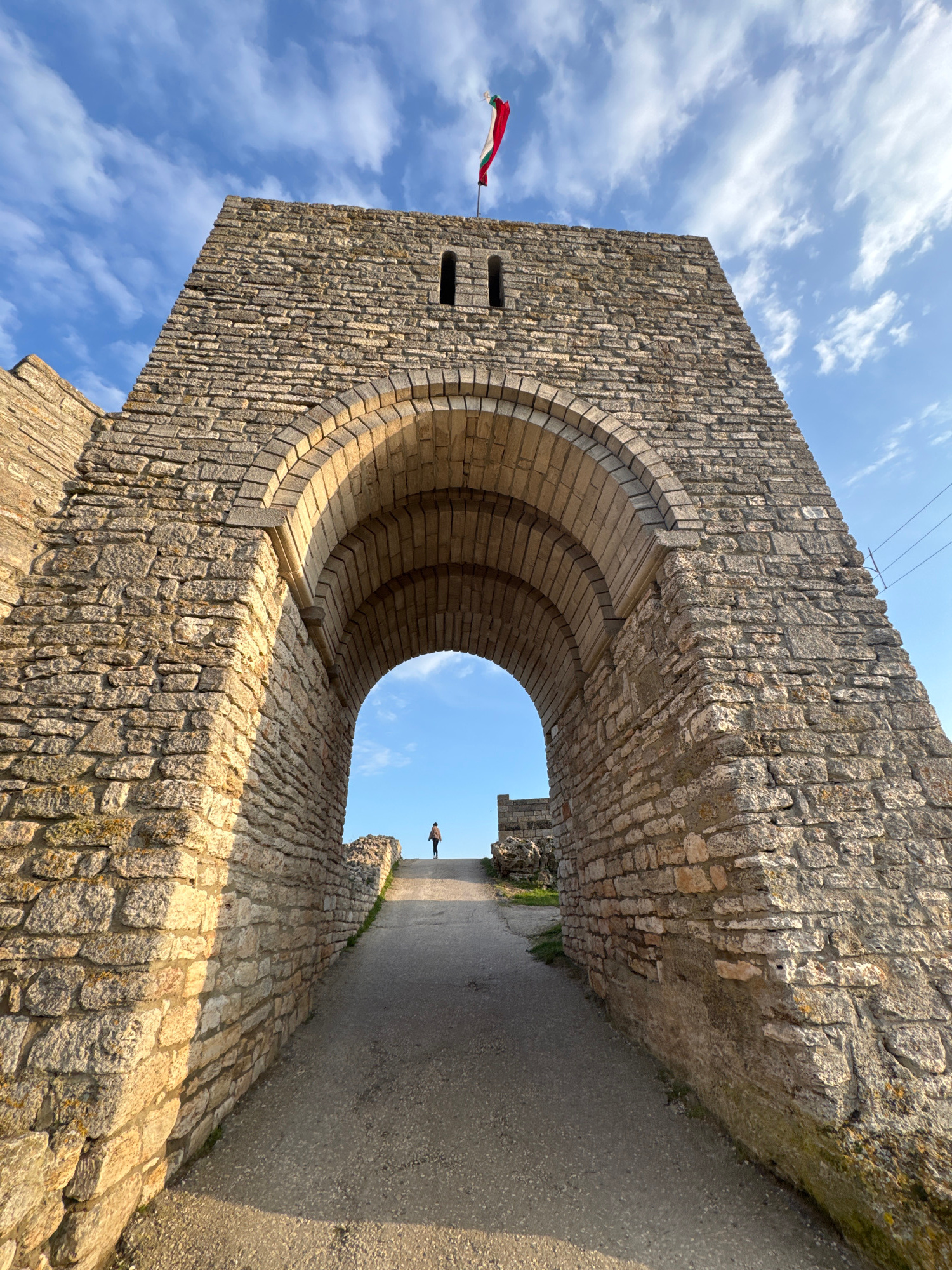 A low-angle shot depicts a stone archway. The arch is constructed of light-colored stones, forming a semi-circular opening. A red and white flag is affixed to the side of the arch. Through the archway…read more