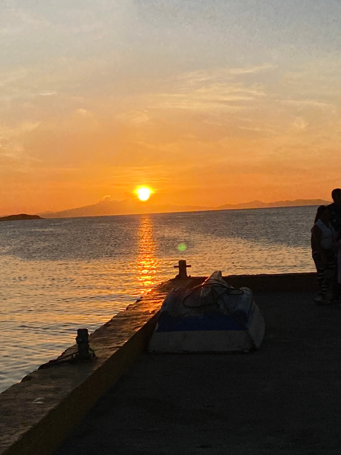 A serene landscape depicts a vibrant sunset illuminating the sea. The sun, low on the horizon, casts a golden glow on the water and sky. A stone pier stretches into the sea, with a small boat docked a…read more