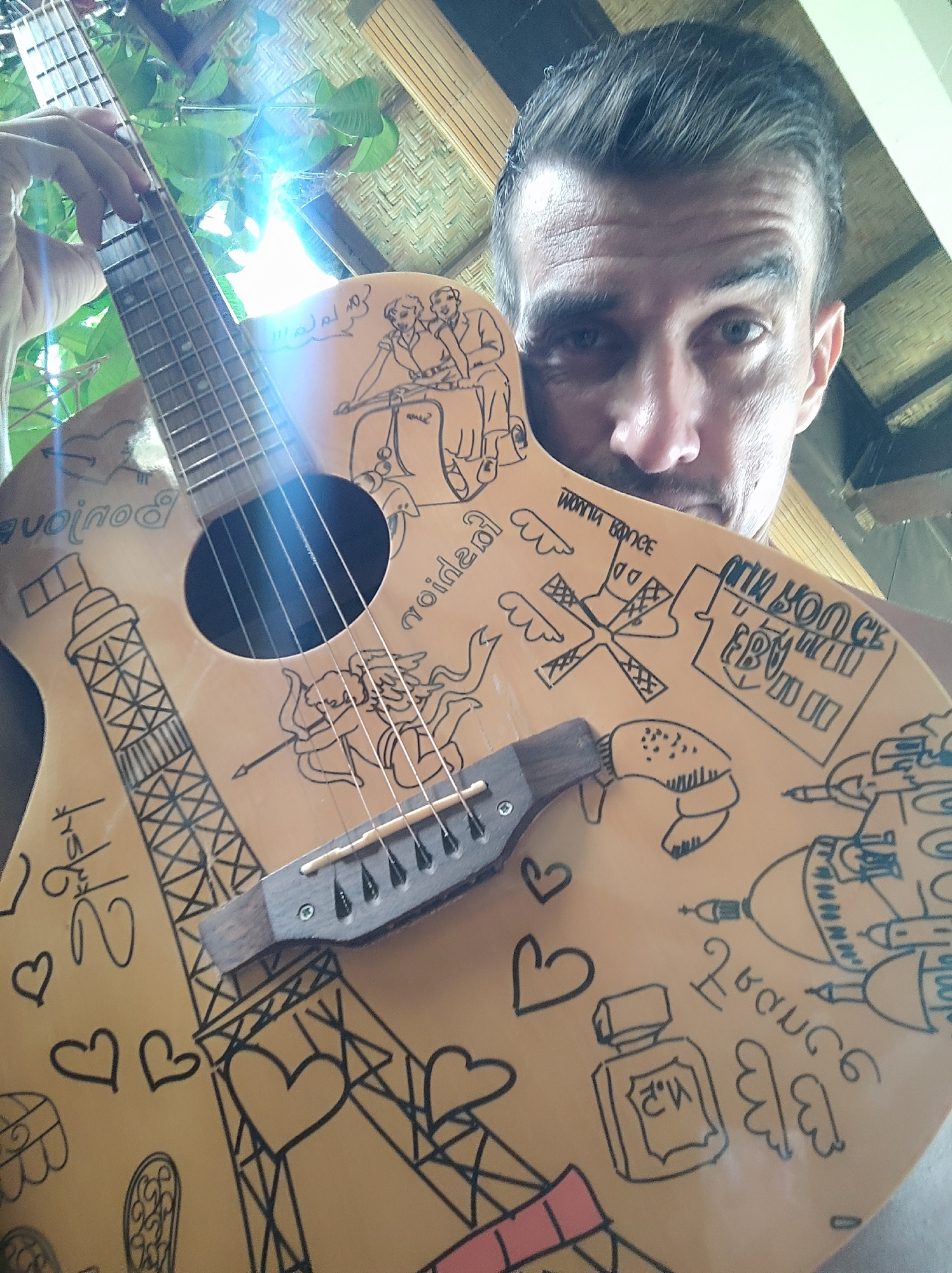 A man is holding a guitar in front of himself. The guitar is decorated with drawings of the Eiffel Tower, hearts, and other symbols associated with Paris. The man is looking at the camera with a neutr…read more