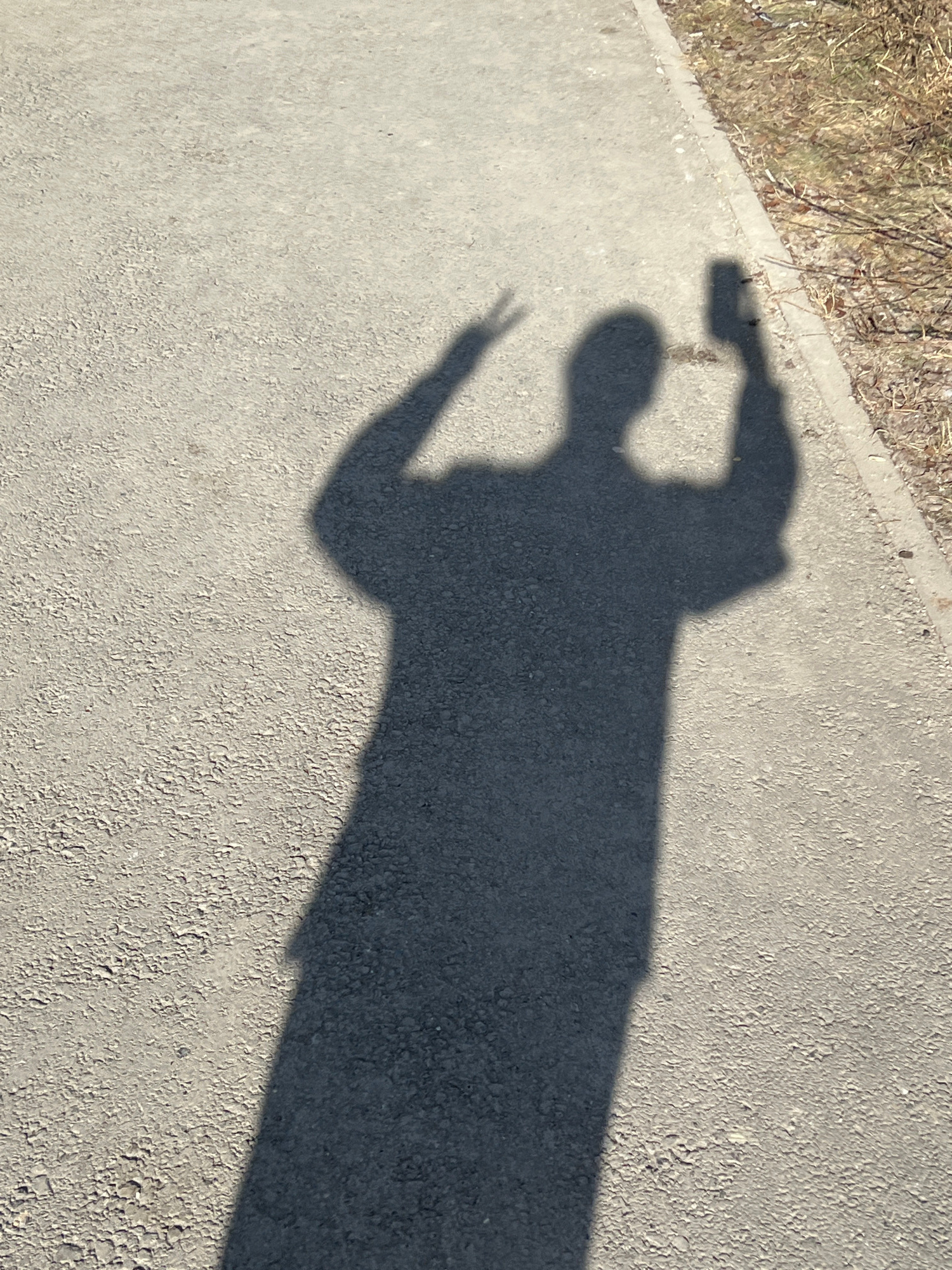 The image depicts the shadow of a person on a paved surface. The person is holding a rectangular object, possibly a phone, in one hand, and making a peace sign with the other. The shadow is elongated,…read more
