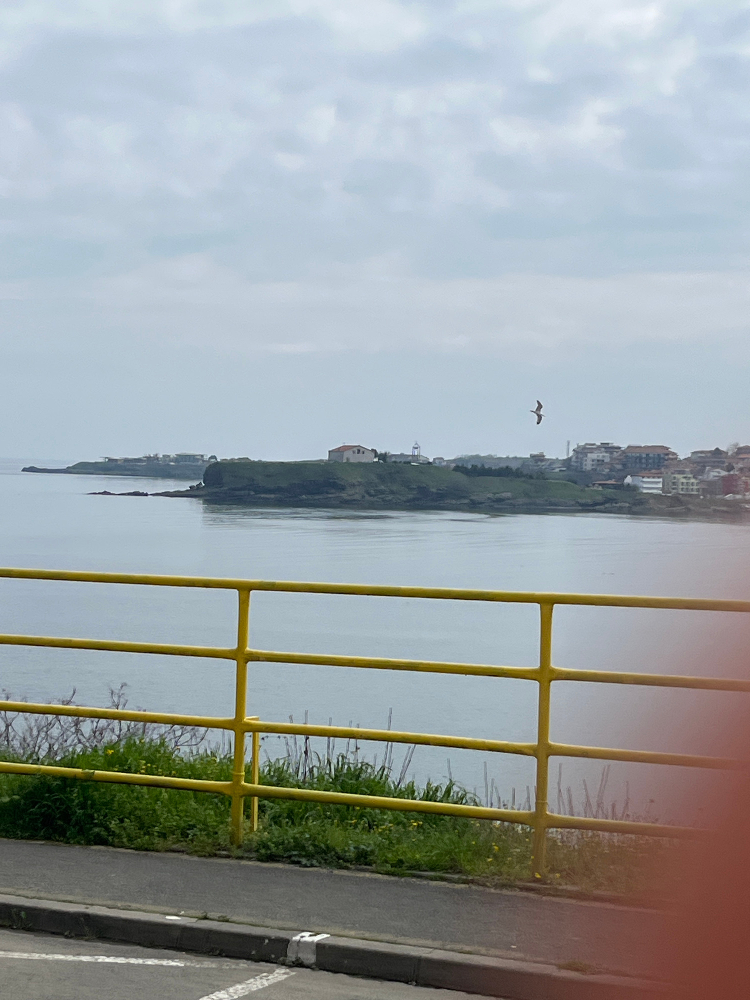 The image shows a waterway, possibly a river or inlet, with buildings and vegetation on the opposite bank. A yellow metal railing is in the foreground, along with some greenery and a section of paveme…read more