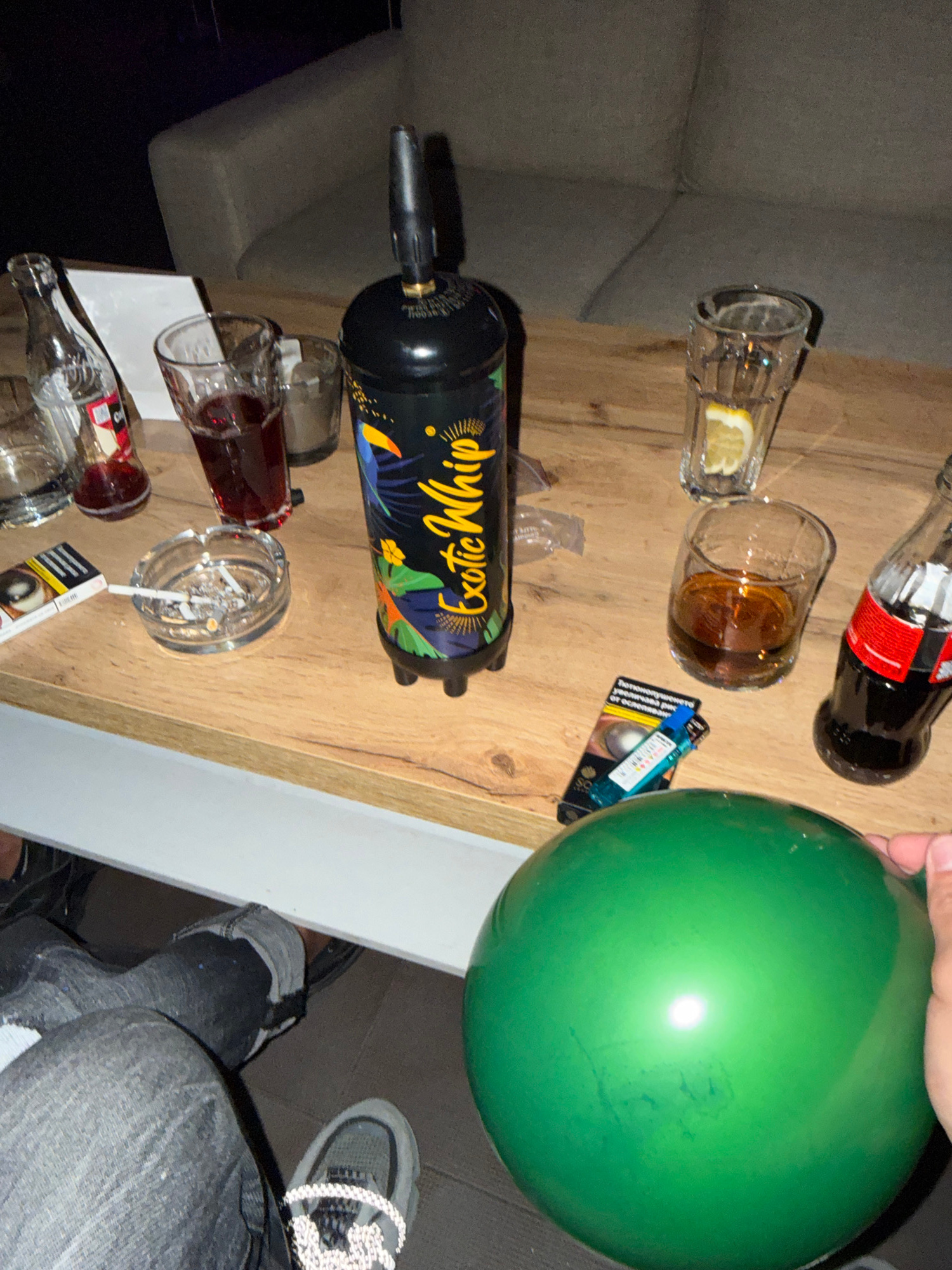 The image depicts a table with various items. On the table are a can of "Exotic Whip", a Coca-Cola bottle, an ashtray with cigarette butts, a glass containing a liquid with a lemon slice, a glass with…read more