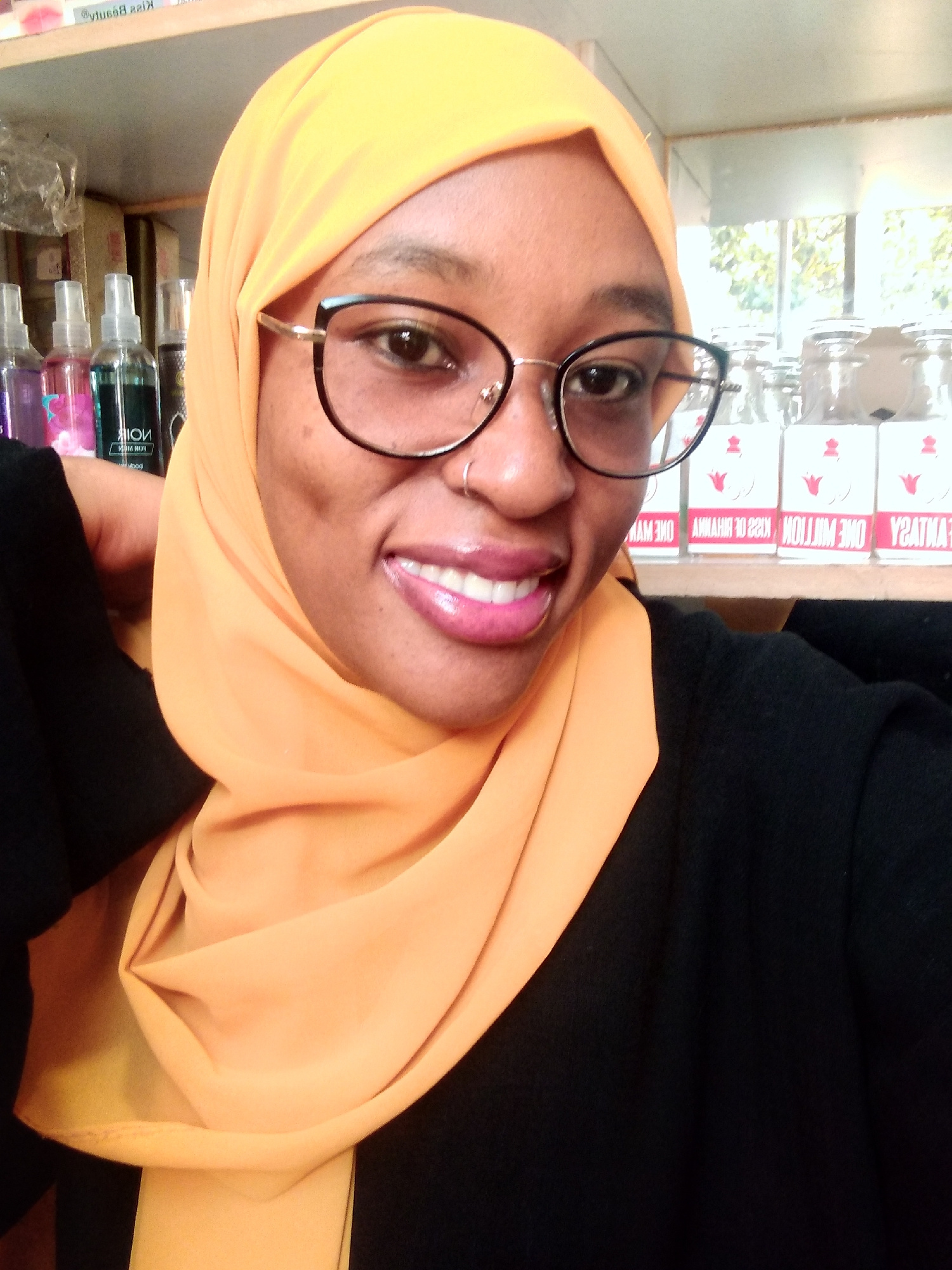 A woman with dark skin wears a bright yellow headscarf and large, round, black-rimmed glasses. She has a small silver nose ring on her left nostril. She is wearing a black sweater or shirt. She smiles…read more
