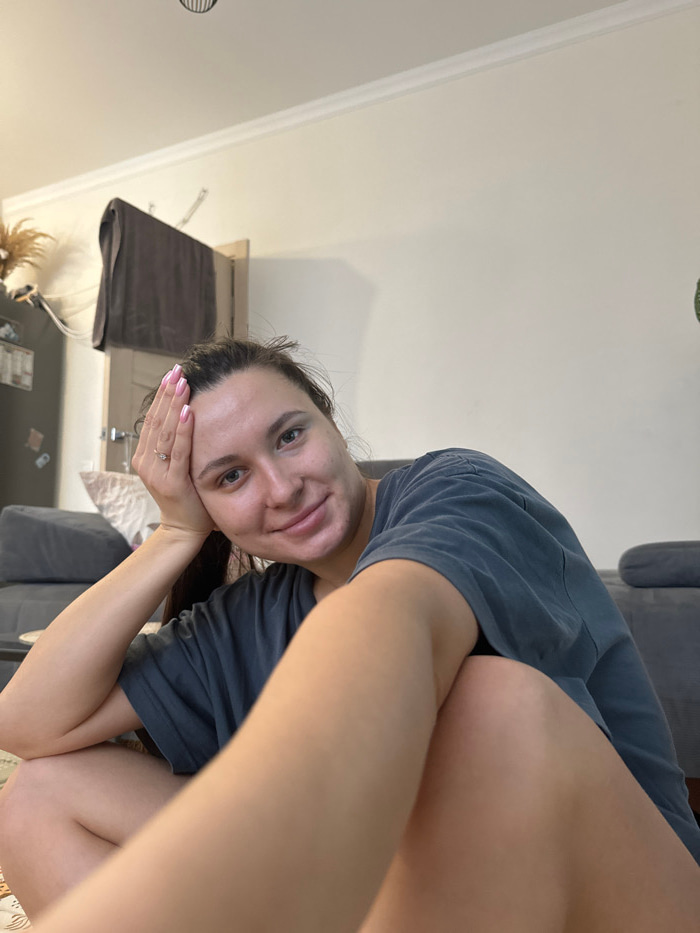 This image depicts an indoor scene in a residential dwelling located in Odintsovo, Russia. A female individual, appearing to be a young adult, is positioned low, likely seated on the floor or a low su…read more