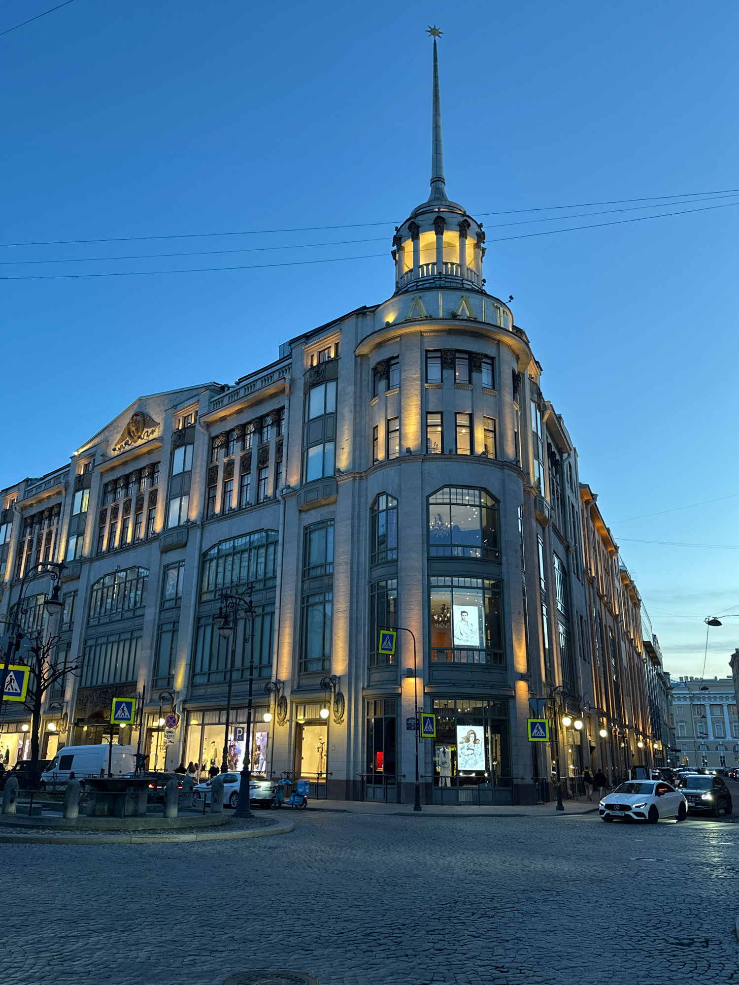 The image depicts the "Singer House," also known as the "House of Books," a prominent building located on Nevsky Prospekt in Saint Petersburg, Russia. The building has a distinctive Art Nouveau archit…read more