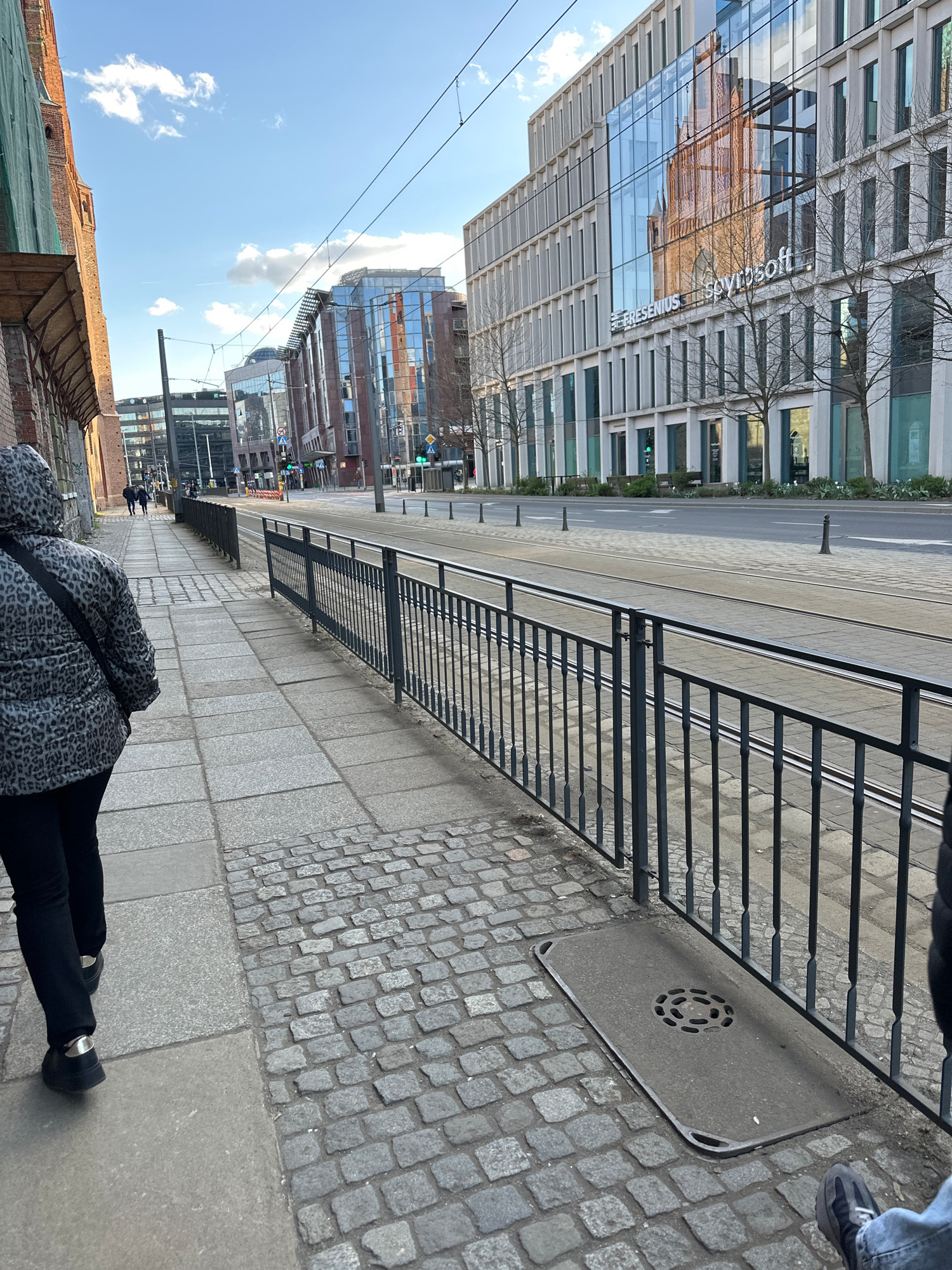 The image depicts a street scene in Wrocław, Poland, with a modern building bearing the word "RENOMA" visible in the background. A pedestrian wearing a black and grey patterned jacket and black trouse…read more