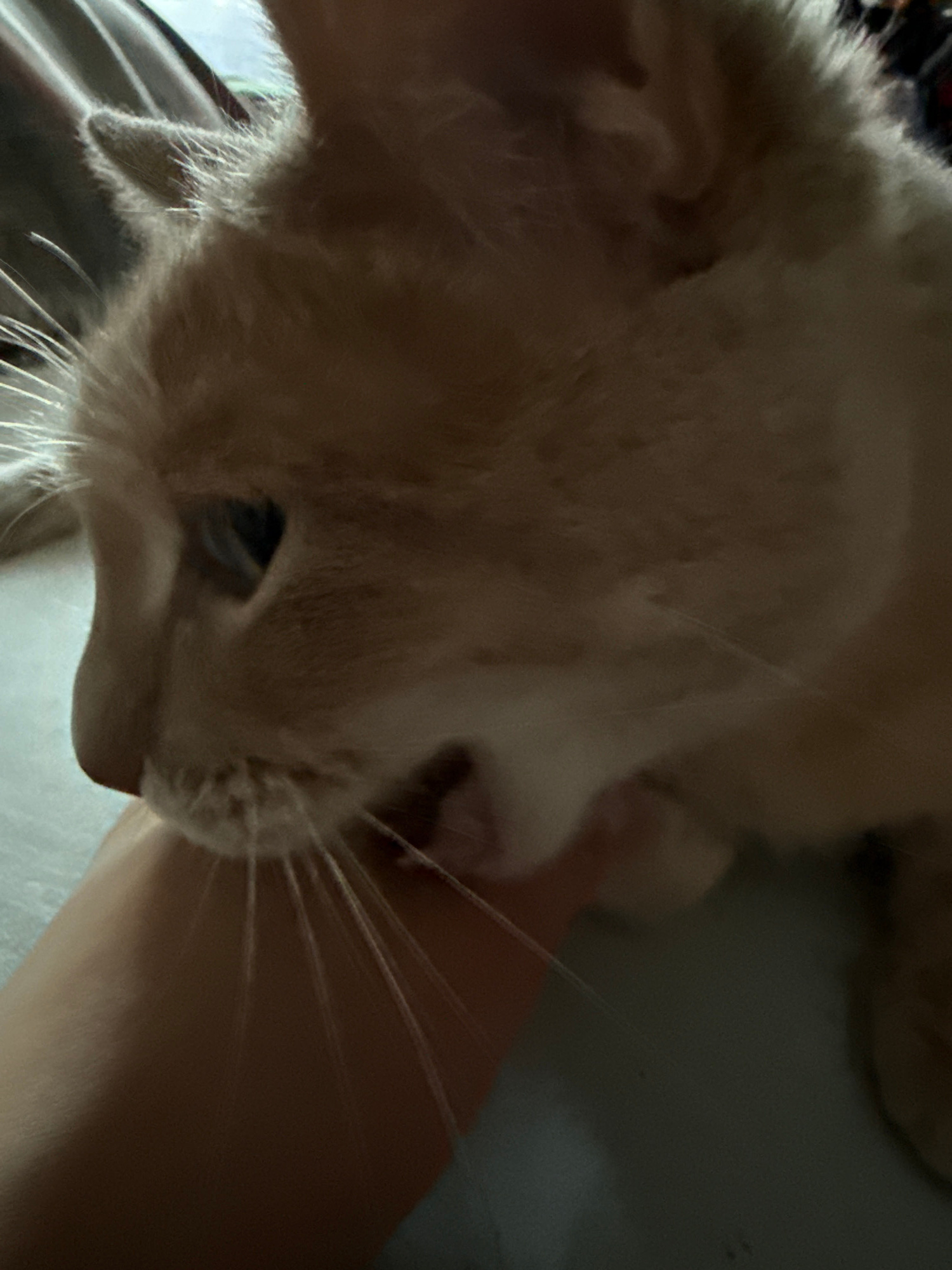 Close-up, indoor shot of a light-colored cat resting on a human arm or leg. The cat's face is the primary focus, with its left ear and one blue eye visible. The cat has light-colored fur and prominent…read more