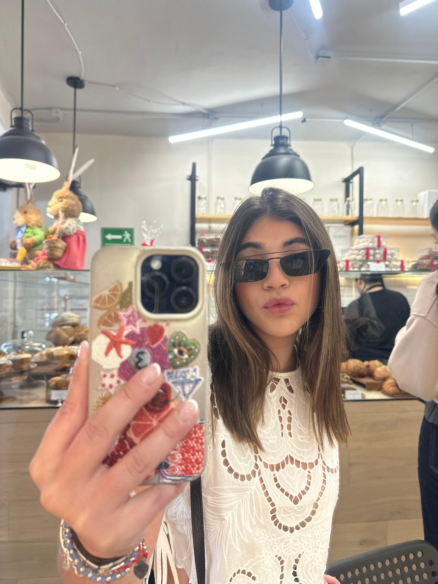 A woman takes a selfie in what appears to be a bakery or pastry shop. She is wearing sunglasses and a white, lacy top. Her phone has a decorative case with various embellishments. The background shows…read more