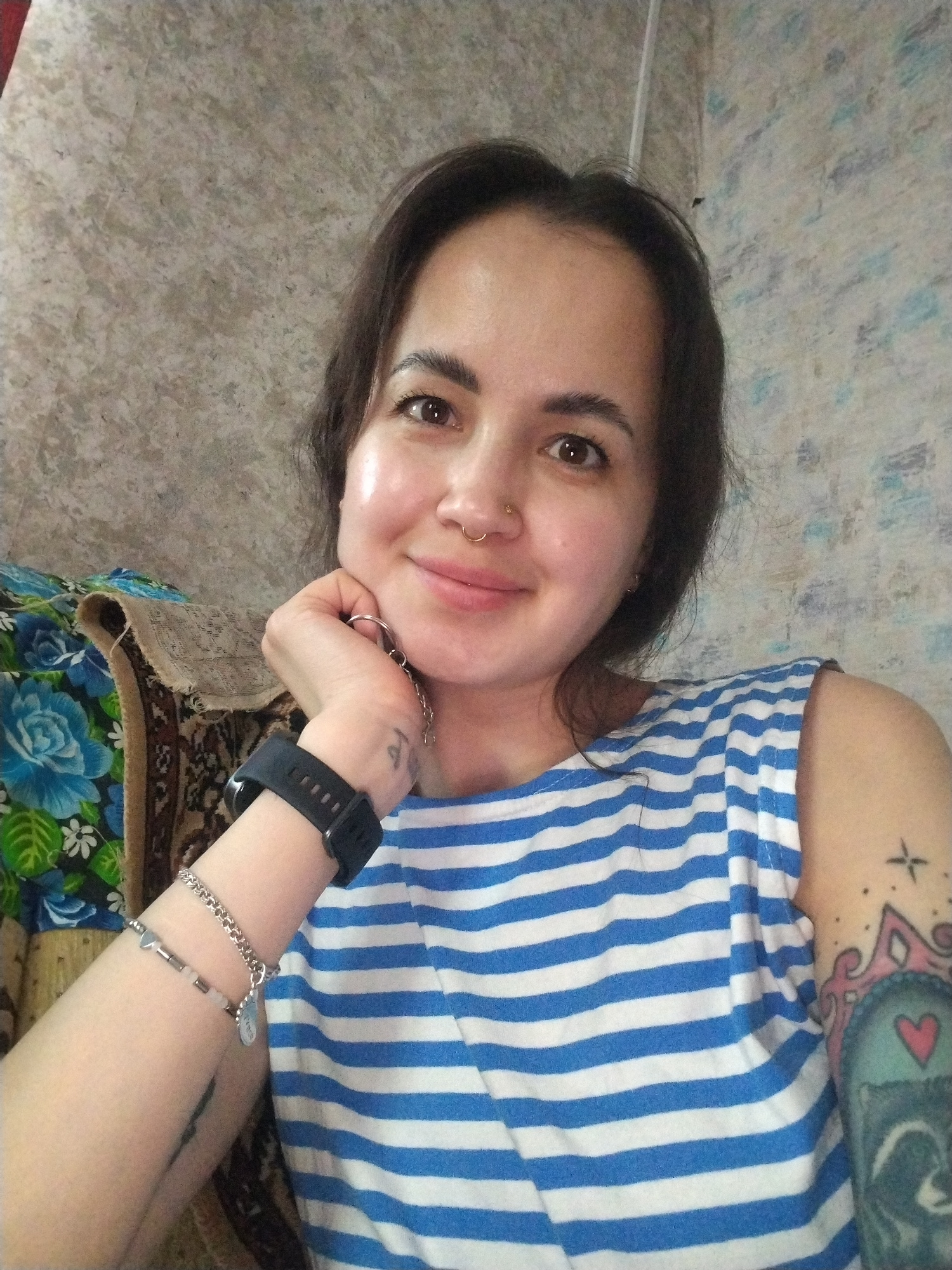 A young woman poses for a selfie. She has dark hair, fair skin, and a nose ring. She is wearing a blue and white striped tank top. On her left arm, she wears a black smartwatch and two bracelets. Her…read more