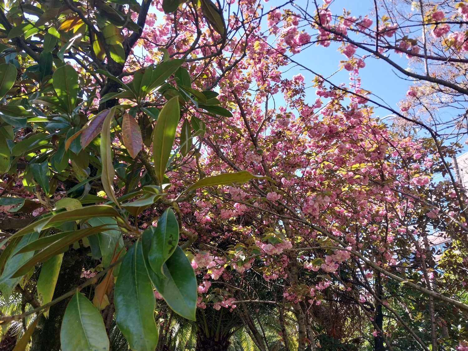 The image presents a vibrant and lush outdoor scene, likely captured in a park or garden in Sochi, Russia. The dominant subjects are two types of trees: one with large, glossy green leaves in the fore…read more