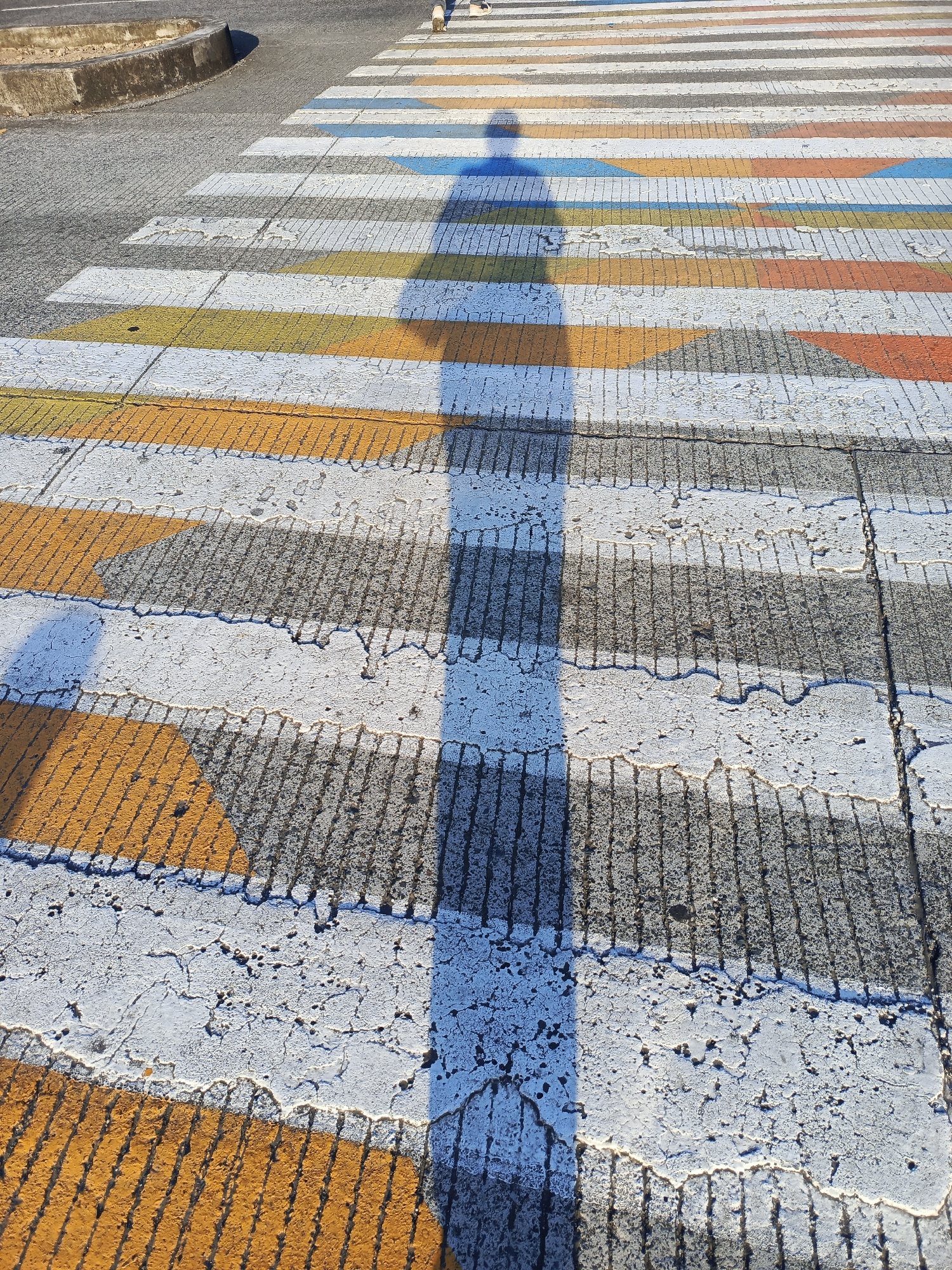 A street in Guayaquil, Ecuador, features a pedestrian crosswalk with alternating white and colored stripes. The colored stripes are a mix of yellow, orange, blue, and gray. A long shadow of a person s…read more