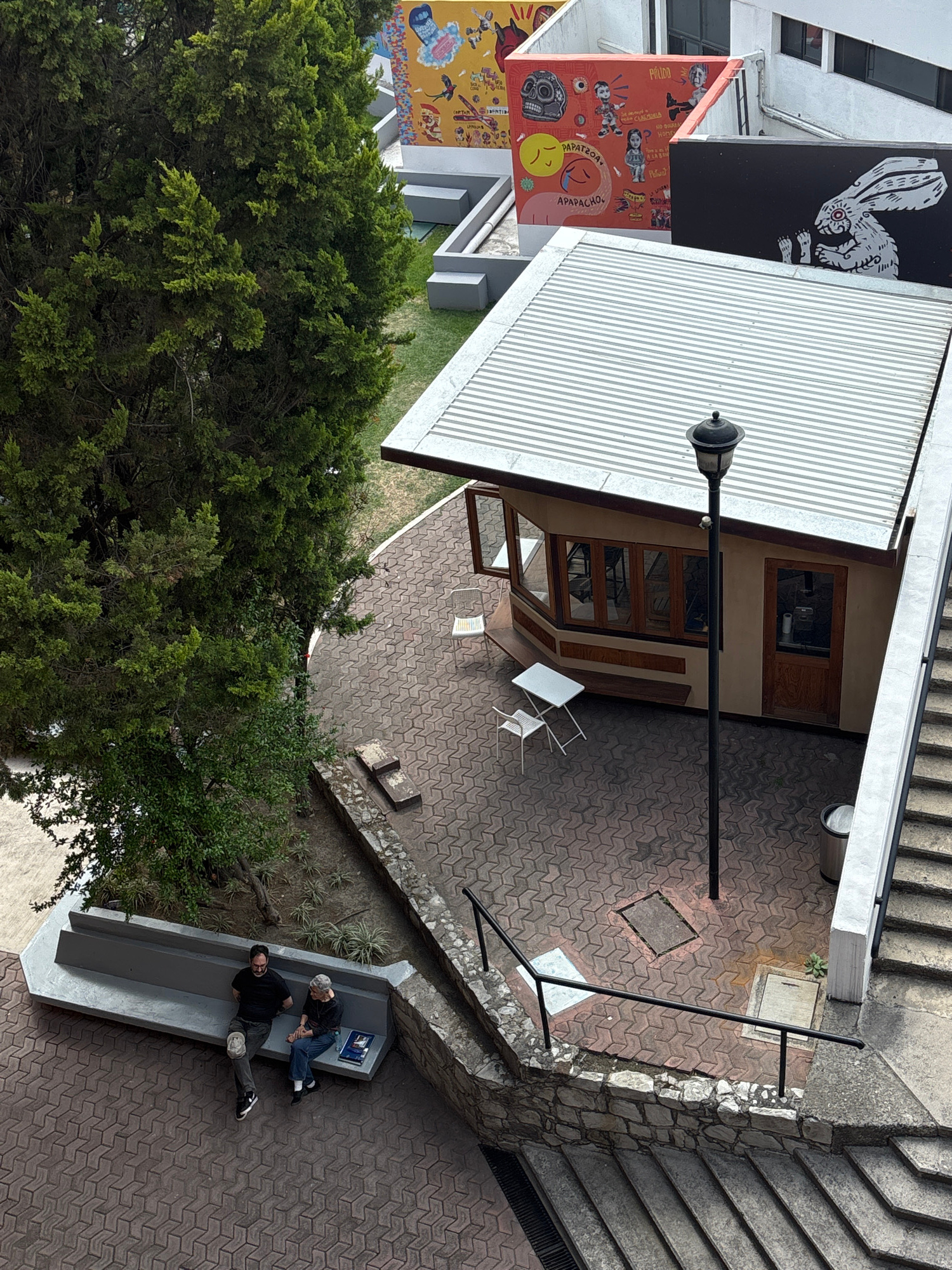 This image, taken from an elevated perspective looking down, captures an outdoor urban area, likely a courtyard or passage between buildings, in San Andrés Cholula, Mexico. The scene is well-lit, indi…read more