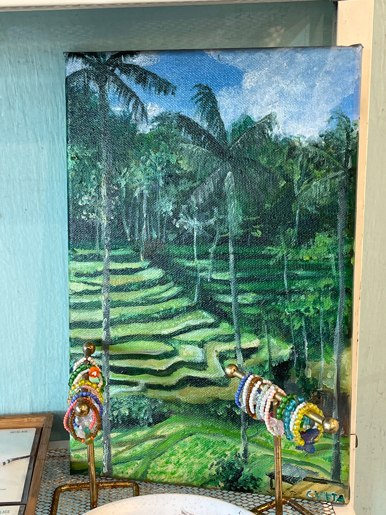 The image shows a painting of a rice paddy in an unknown location in Indonesia. The painting is on canvas and depicts a blue sky with a palm tree on the left side, and lush green rice terraces stretch…read more