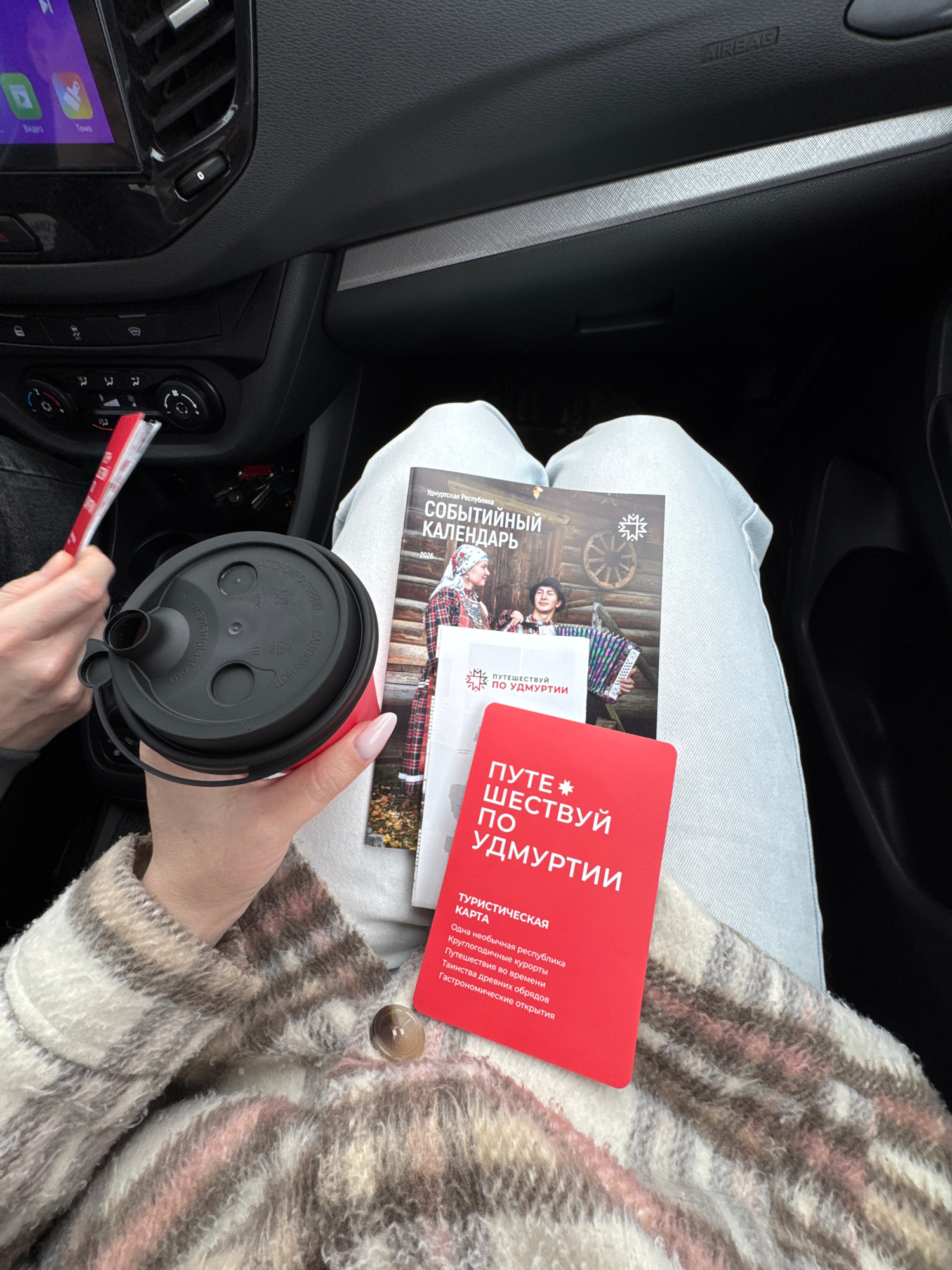 Here is a description of the image: **Scene:** The image appears to be taken inside a car, likely in Votkinsk, Russia, based on the Cyrillic text on the documents. **People:** A person is visible by…read more
