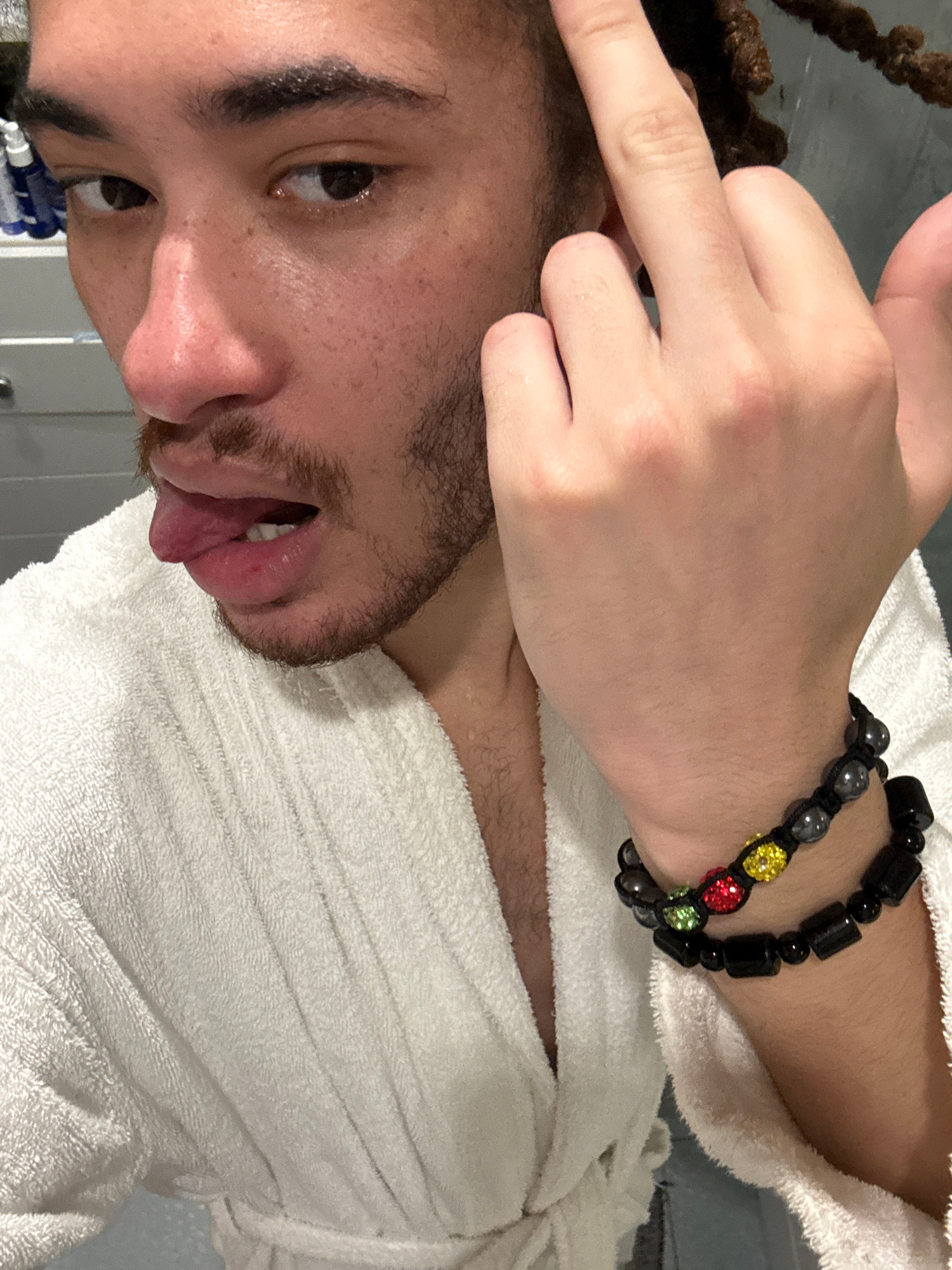 A close-up, low-angle shot depicts a man in a white terrycloth robe. His face is partially visible, showing facial hair, dark eyebrows, and one visible eye. A hand with a dark beaded bracelet rests on…read more