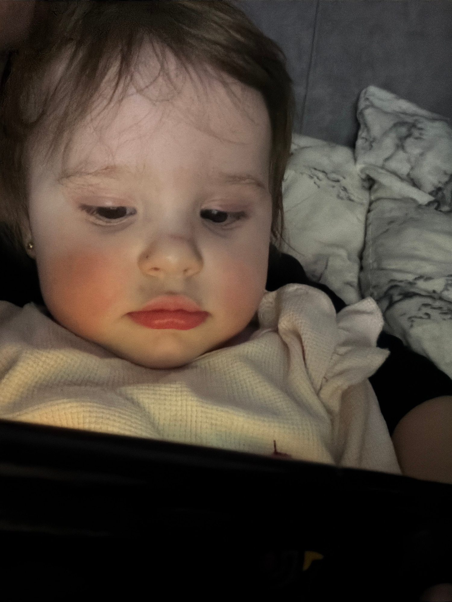 A young child lies on a gray surface next to a patterned pillow. The child is facing the camera with slightly open eyes and lips. The child is wearing a light-colored waffle-knit shirt. A dark object…read more