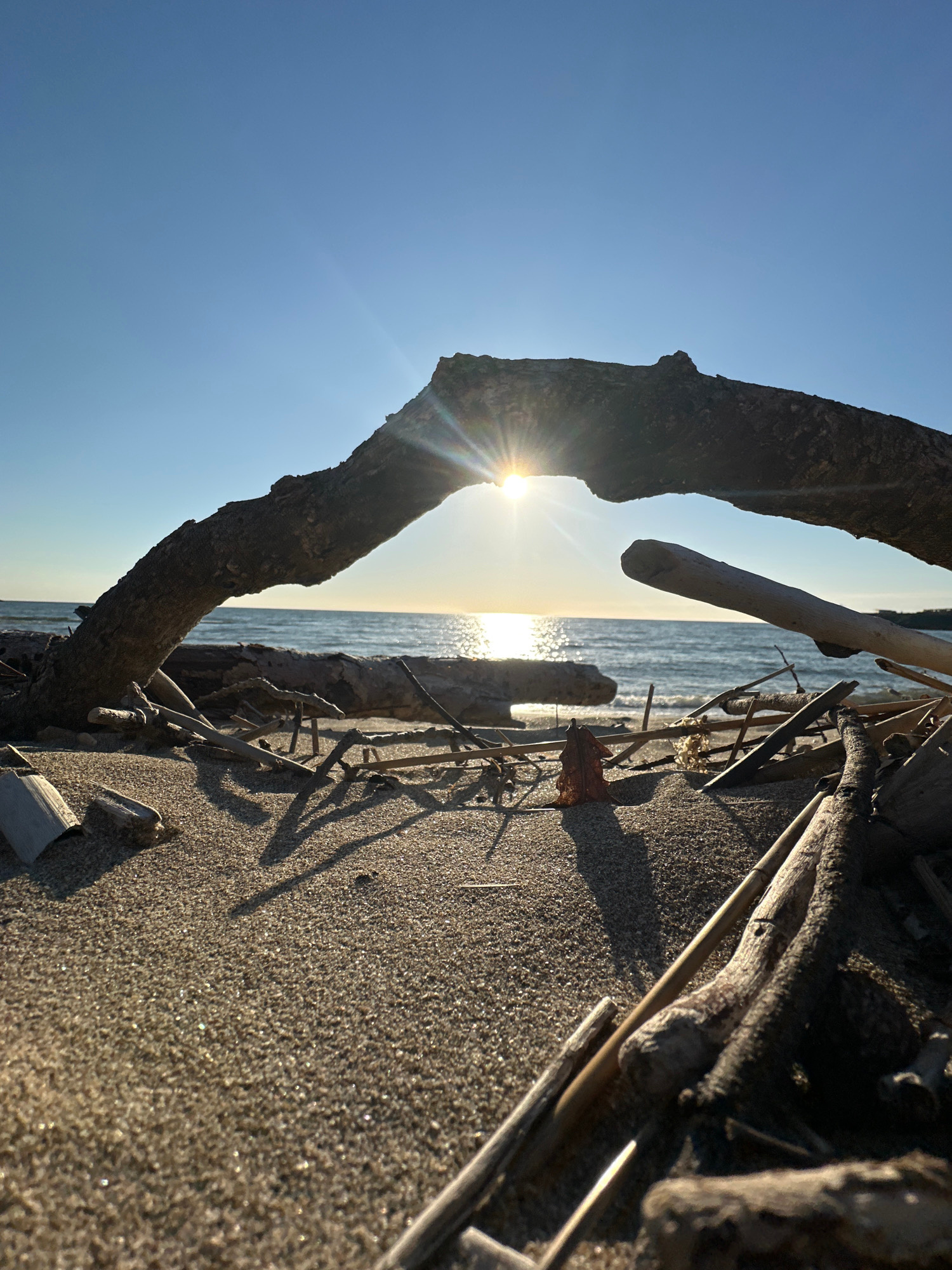 The image shows a beach landscape, likely in Kiten, Bulgaria, given the request. A sandy beach occupies the left side of the frame, scattered with driftwood and small pieces of debris. In the middle g…read more