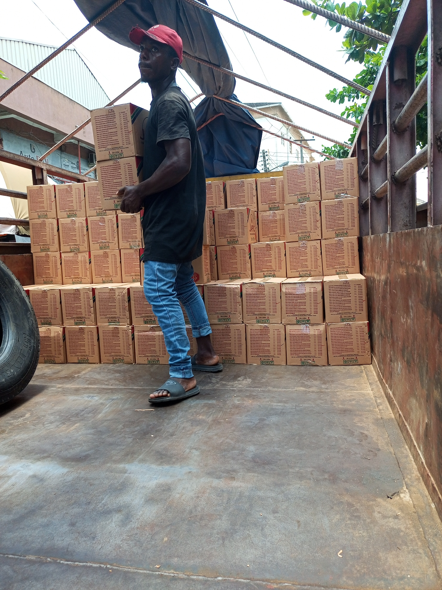 A man is depicted inside the bed of a truck, handling two stacked cardboard boxes. He has dark skin, wears a black t-shirt, light blue jeans rolled up at the ankles, and black slide sandals. A red bas…read more