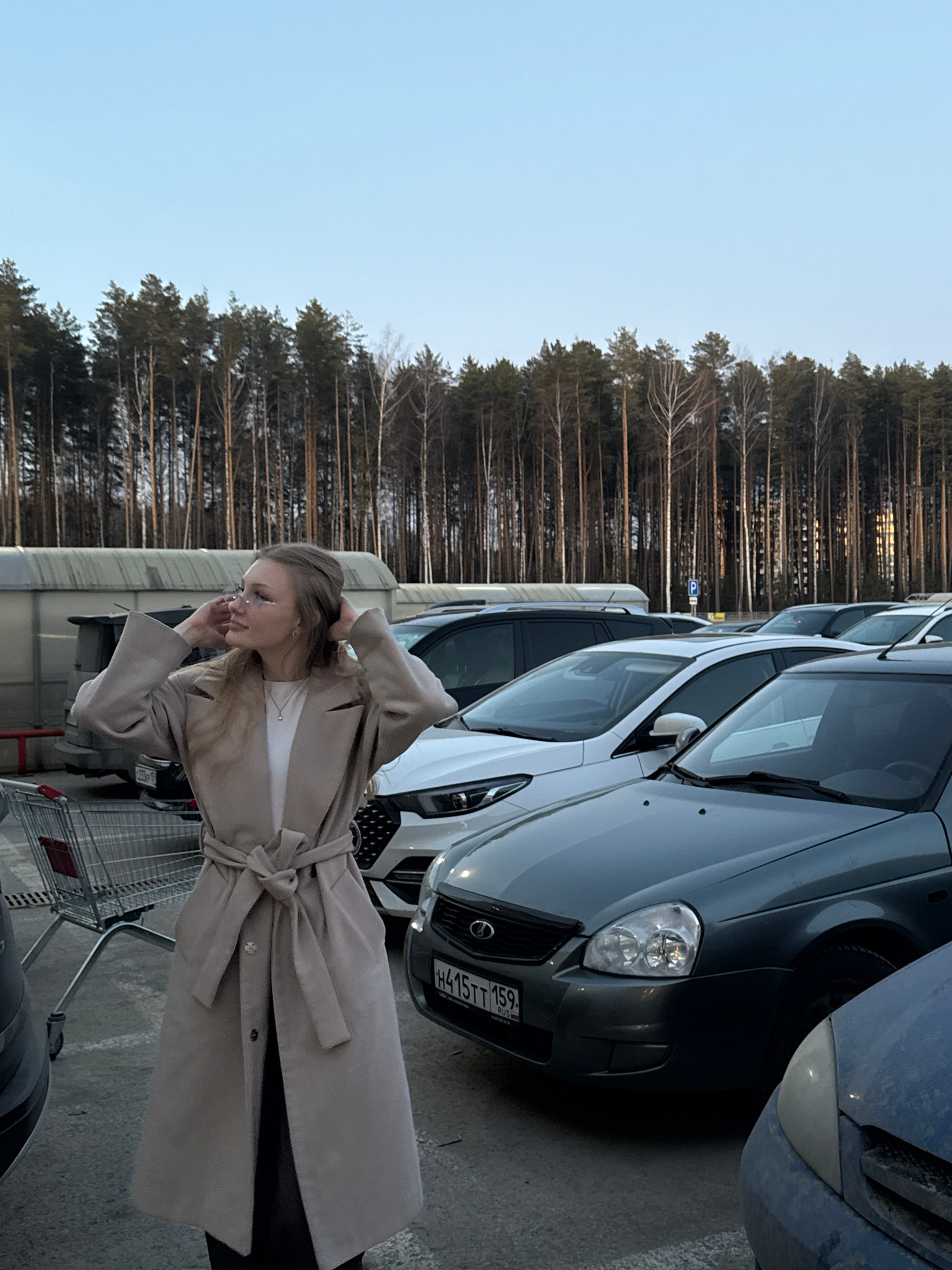 A woman in a beige trench coat stands next to a shopping cart in a parking lot in Perm, Russia. She has her hands near her head, possibly adjusting her hair or glasses. The parking lot is adjacent to…read more