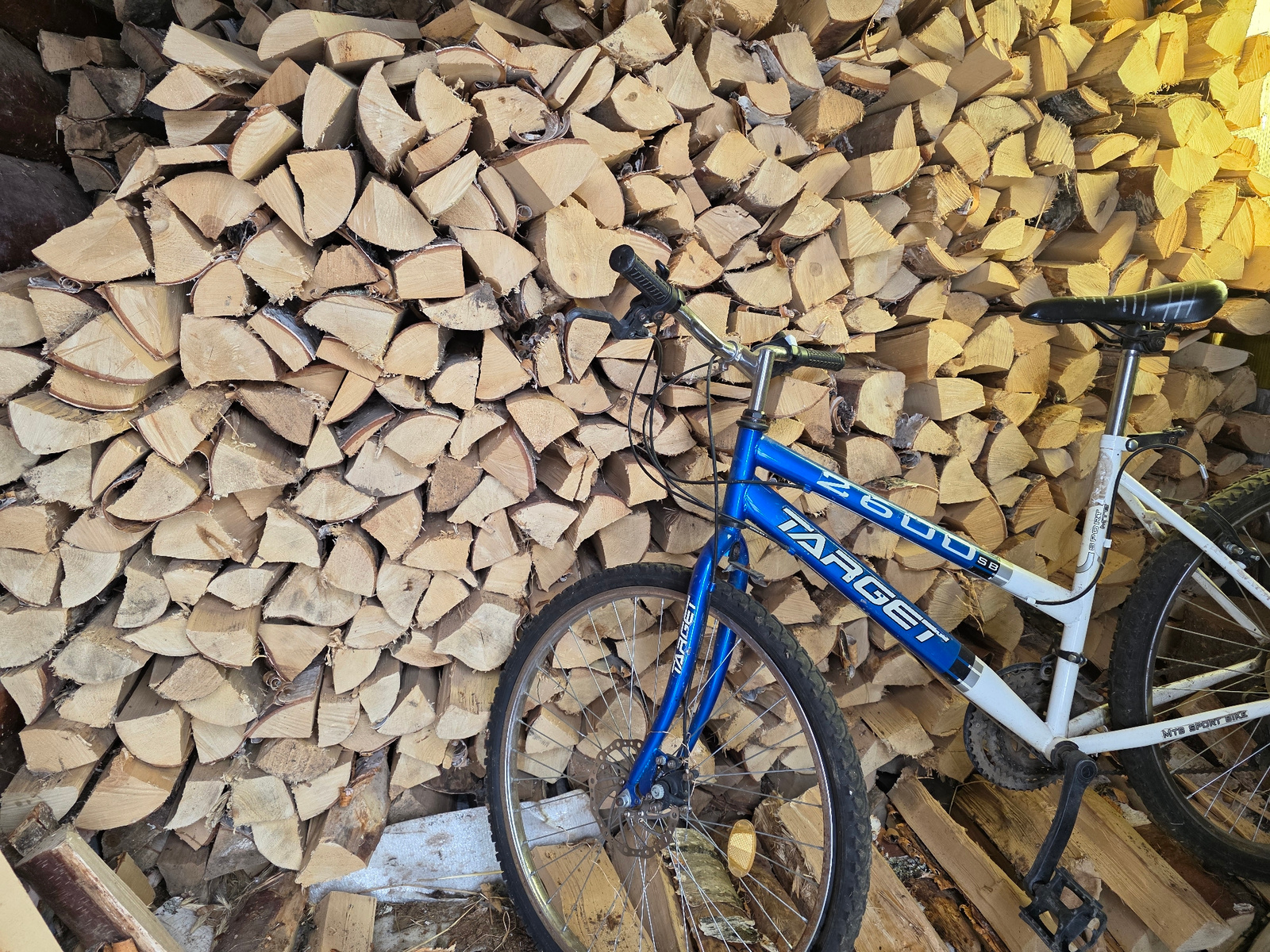 The image shows a blue and white Target 2600 SB mountain bike leaning against a large stack of split firewood. The location is Chaikovsky, Russia, based on geographical references not visible in the i…read more