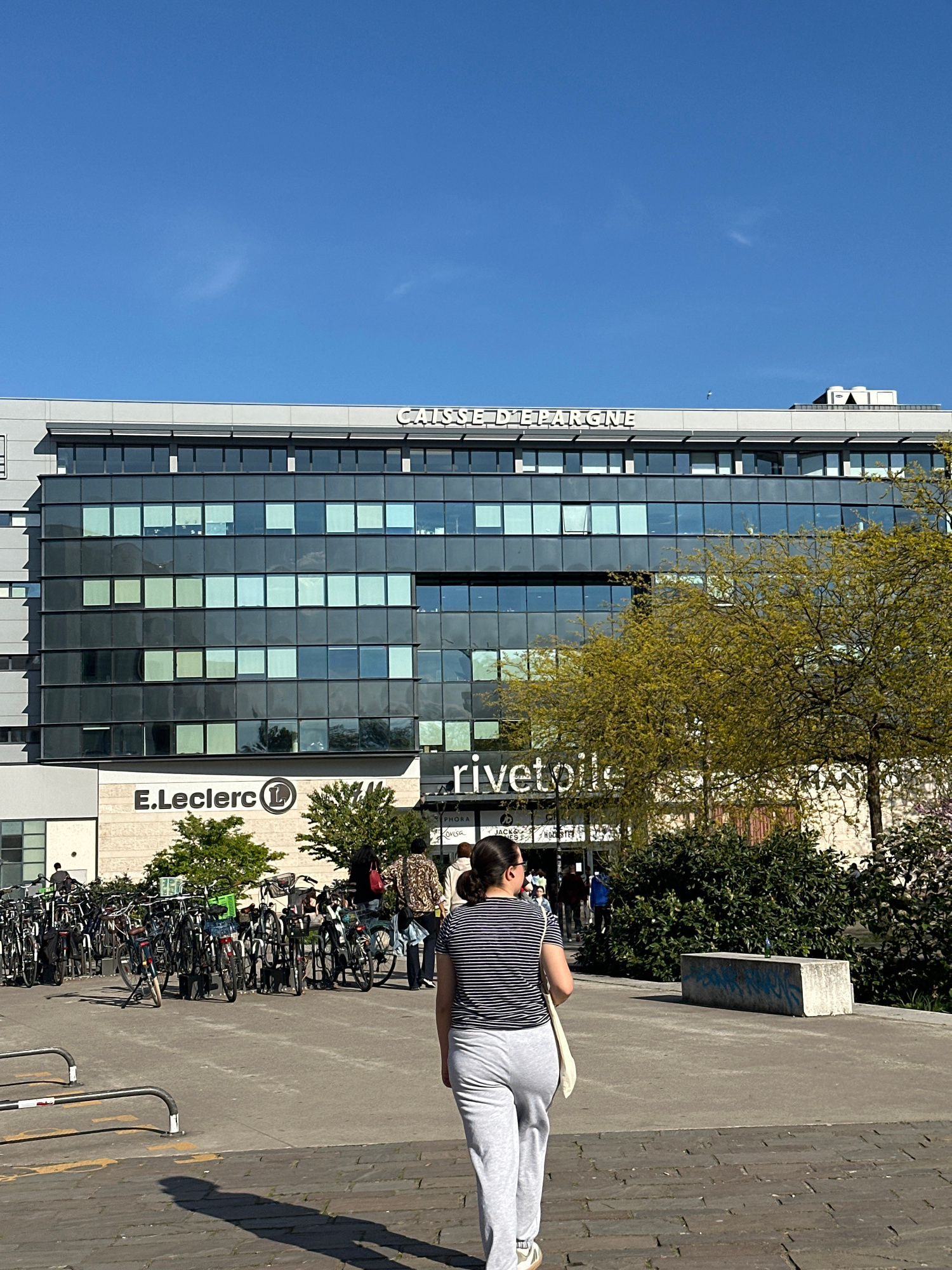 A horizontal, eye-level shot captures a tall, modern building in Strasbourg, France, against a clear blue sky. The building, identified as the "Caisse d'Epargne" and the "E.Leclerc Rivetoile," is a mu…read more