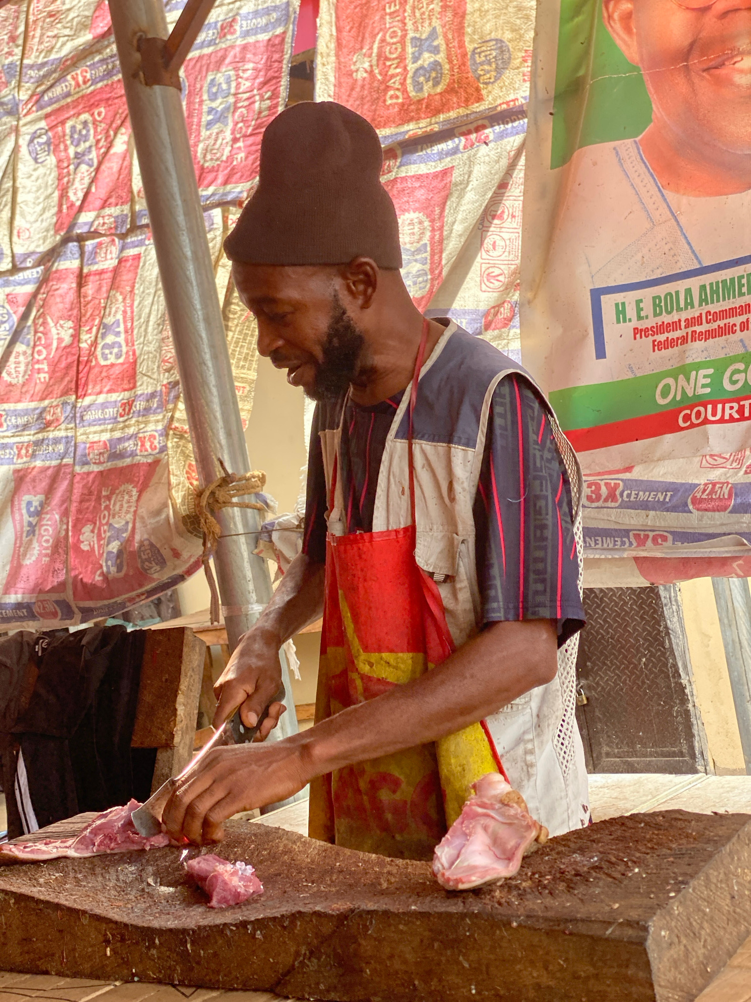 The image shows a man, likely a butcher or meat vendor, engrossed in cutting red meat on a sturdy wooden chopping block. He is wearing an apron over a patterned short-sleeved shirt and a dark cap, andβ¦read more