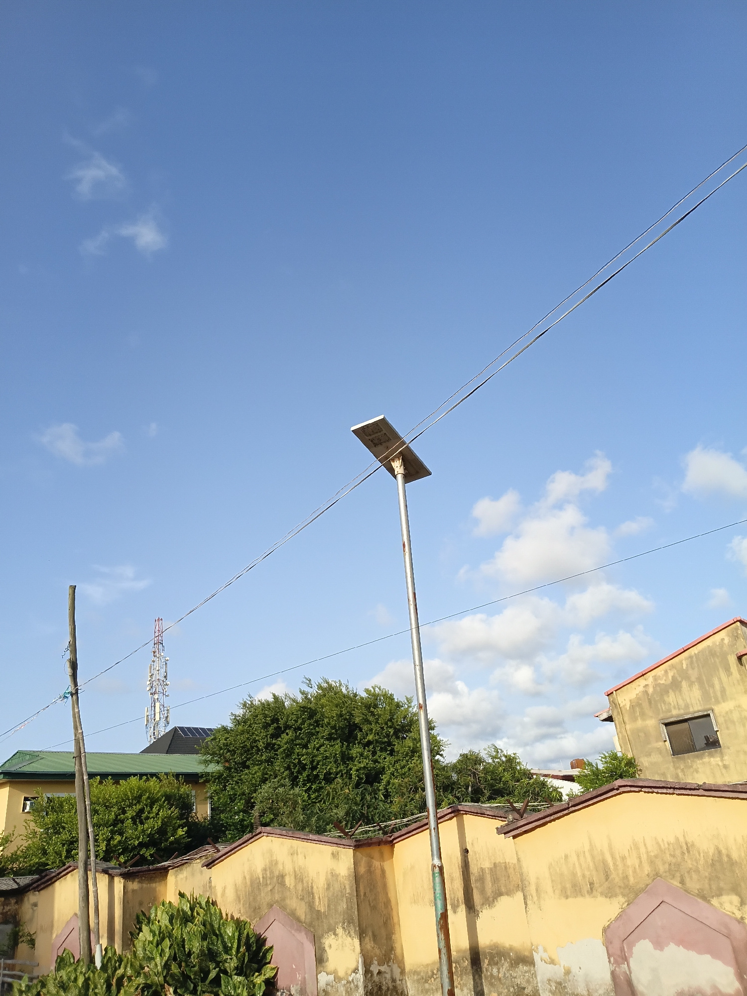 The image shows a view looking up towards the sky, capturing a combination of urban and natural elements. In the foreground, power lines stretch across the frame, partially obscuring the blue sky dott…read more