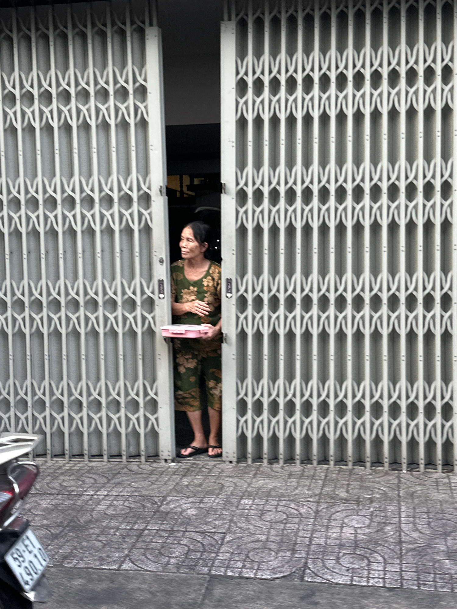 A medium, eye-level, angled outdoor shot shows a person standing at an partially open metal grid door on a street, with a motorcycle parked nearby in the city of Thủ Đức, Vietnam. The grid door, paint…read more