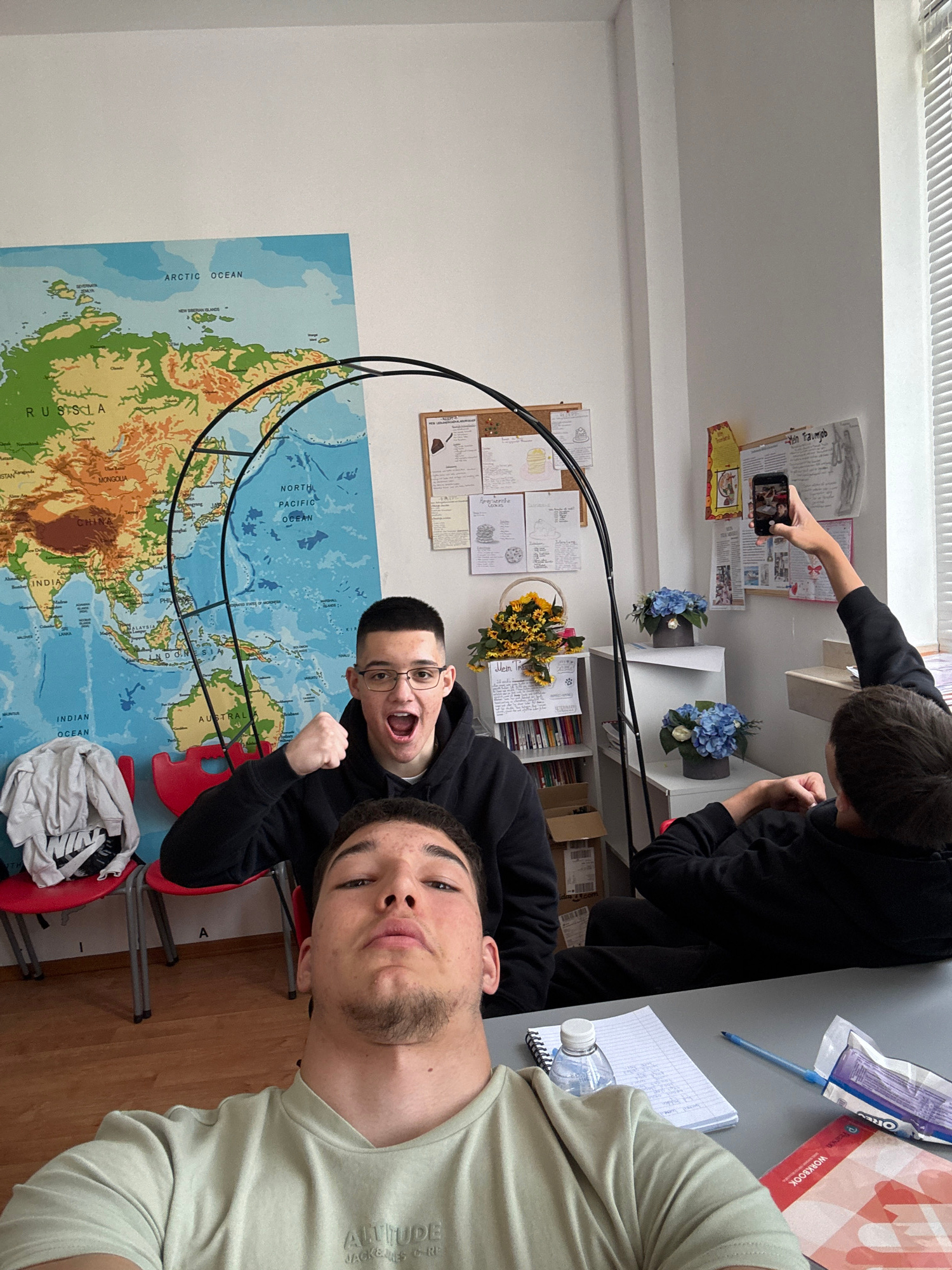 This media file, captured in what appears to be a classroom or study room in Zlatograd, Bulgaria, shows three young men engaged in casual activity. The image is oriented vertically (rotated 90 degrees…read more