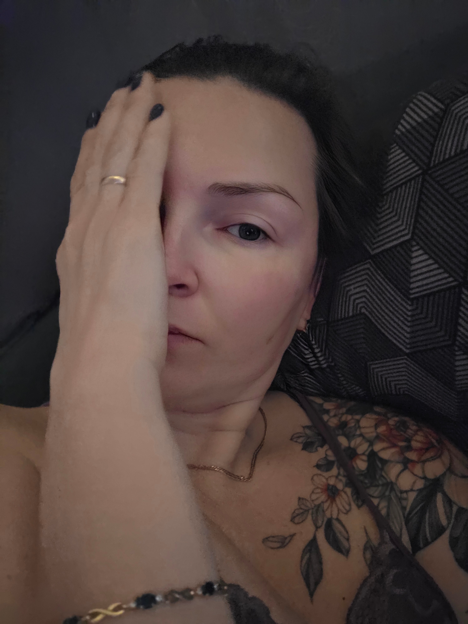 A woman is lying down, facing the camera. Her right hand is covering the upper part of her face, obscuring her forehead and eyebrow. She has a gold ring on her hand. Her left eye is visible and open.…read more