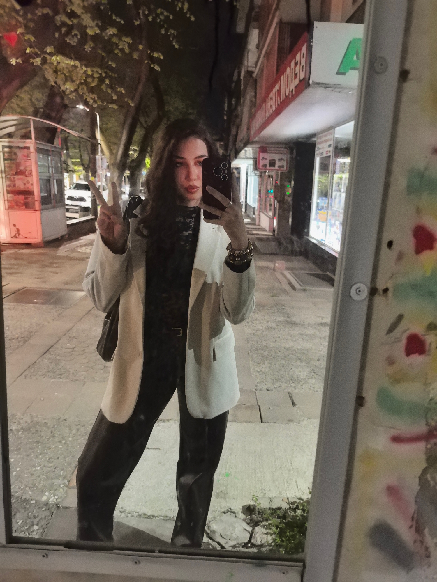 A young woman takes a mirror selfie on a city street at night. She wears a white blazer, a dark patterned top, black pants, and several bracelets. She is holding up a phone to take the picture, and ma…read more
