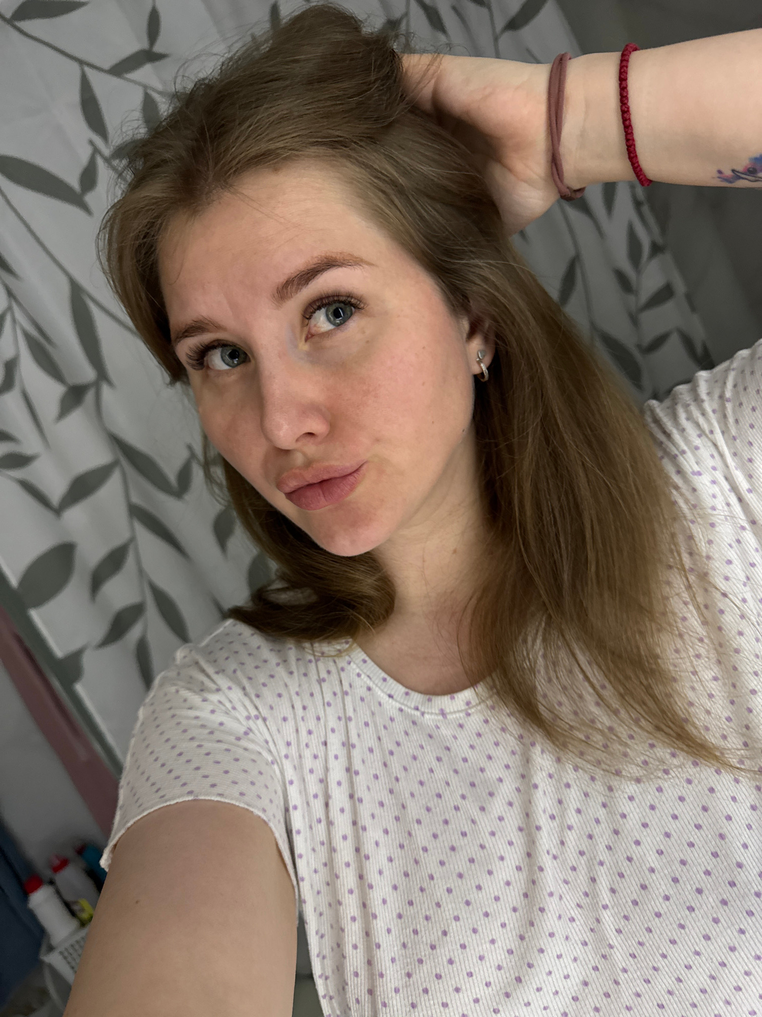 A woman with fair skin and light brown hair is lying on a bed. She has blue eyes and is wearing a white t-shirt with small purple polka dots. On her left wrist, there are two bracelets: a thin red one…read more