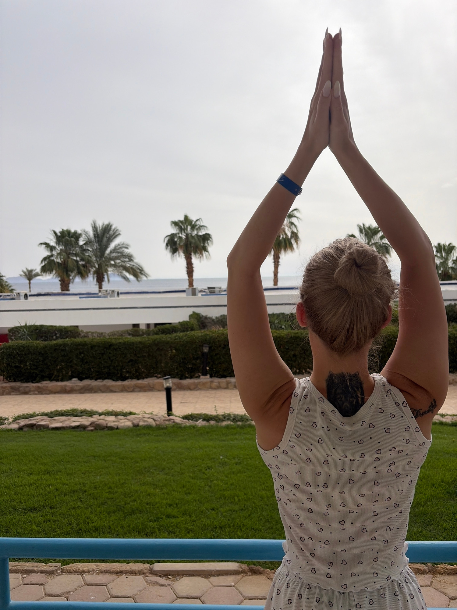 Here is a description of the image: A woman is standing near a railing, facing away from the camera and holding her hands above her head in a triangular shape. She has blonde hair pulled back in a bu…read more