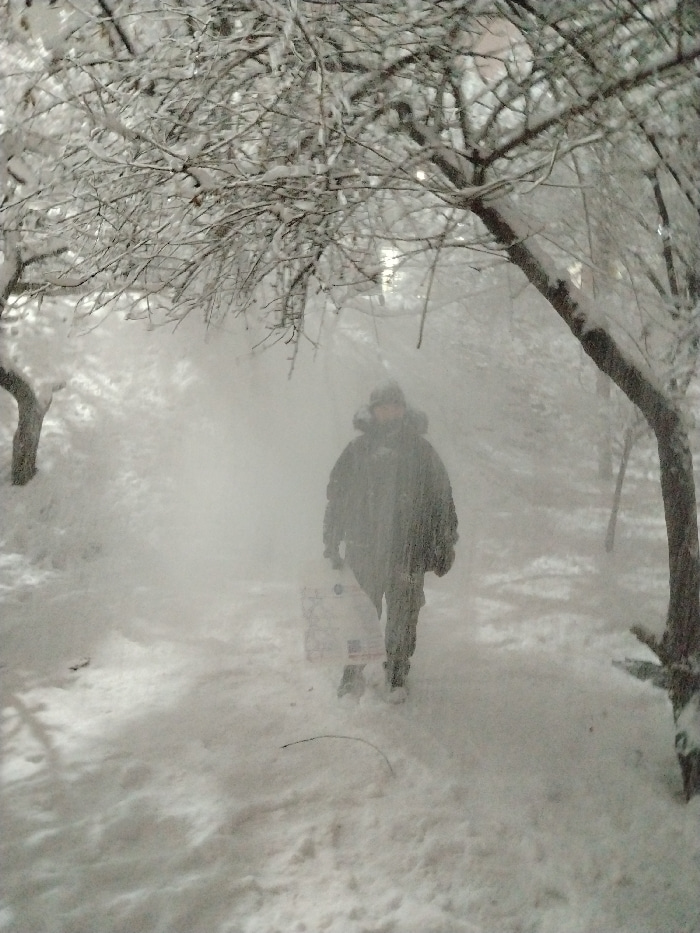 The scene depicts a solitary individual walking through a heavily snow-covered outdoor environment in Tashkent, Uzbekistan, during what appears to be a significant snowfall or blizzard. The ground isβ¦read more
