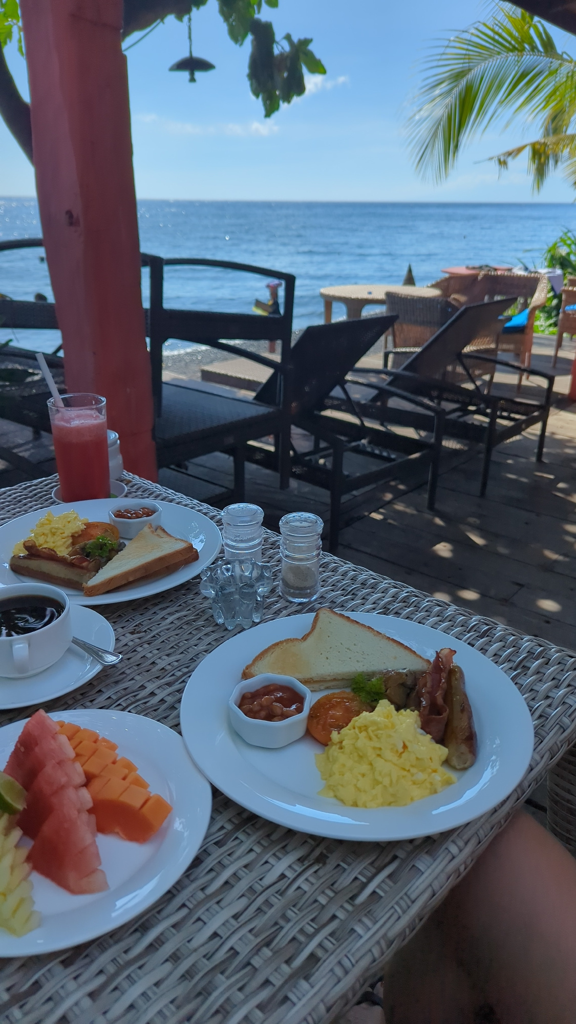 A breakfast scene is presented on a wicker table, with a partial view of the sea visible in the background. The breakfast includes a plate with scrambled eggs, sausage, bacon, toast, and a small dish…read more