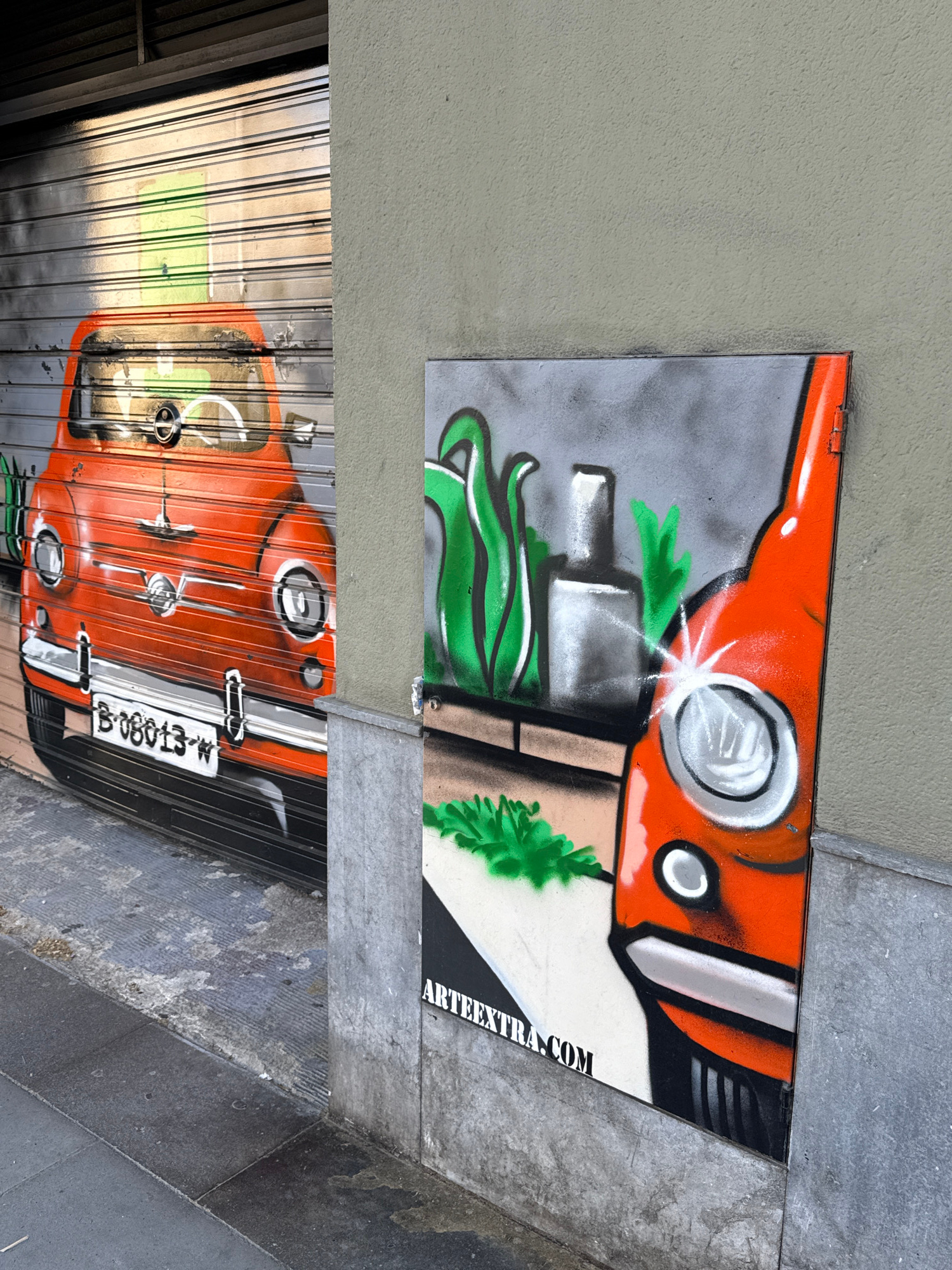 The image shows two sections of graffiti art in Barcelona, Spain. The lower section, painted on a corrugated metal surface, depicts the front of an orange vehicle with distinctive round headlights. Thβ¦read more