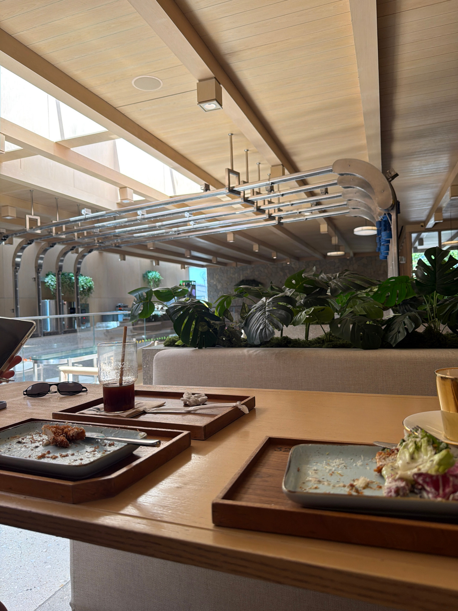 This image captures the interior of a modern, airy cafe or restaurant, likely set in a tropical location such as North Kuta, Indonesia, given the context and visible flora. The architecture features l…read more