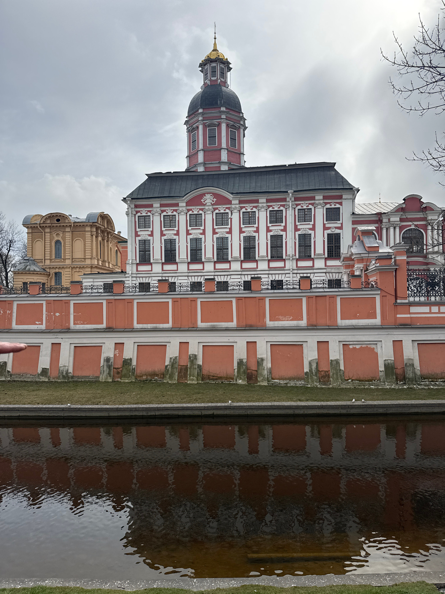 The image depicts the Smolny Cathedral in Saint Petersburg, Russia, reflected in a canal. The architecture of the cathedral is visible, including its dome, windows, and red and white facade. A section…read more