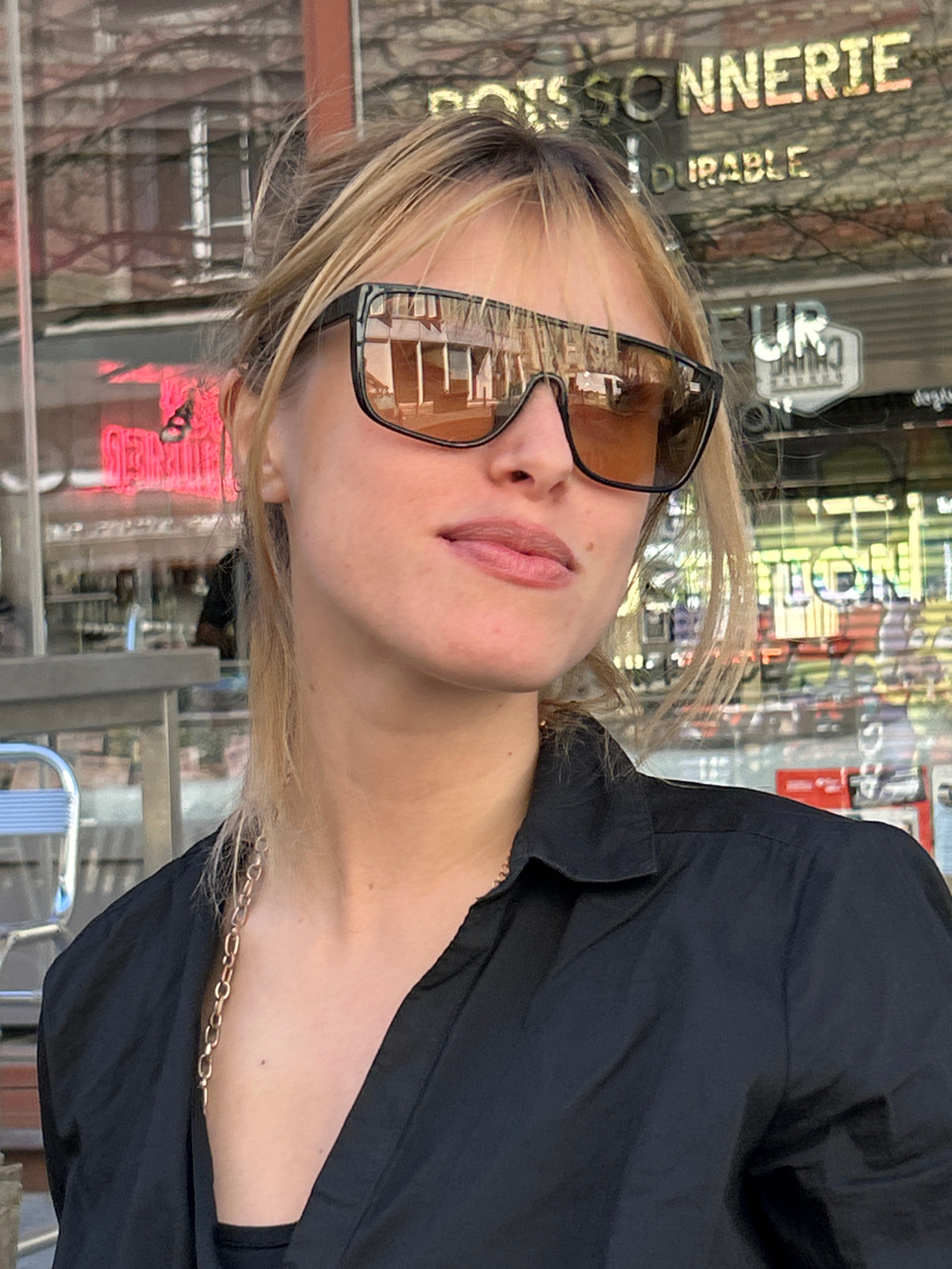A woman with blonde hair is pictured from the chest up, wearing sunglasses and a black shirt. A chain necklace is visible around her neck. Reflected in her sunglasses are buildings and structures, inc…read more