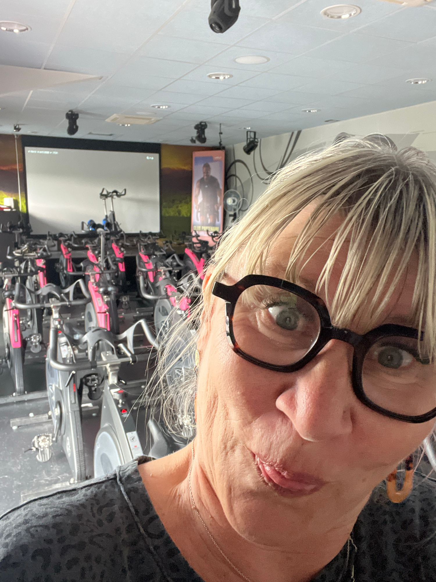 A woman with short, gray and blonde hair, wearing black glasses and a patterned black top, takes a selfie in an indoor cycling studio. The studio contains rows of exercise bikes with pink accents. A l…read more
