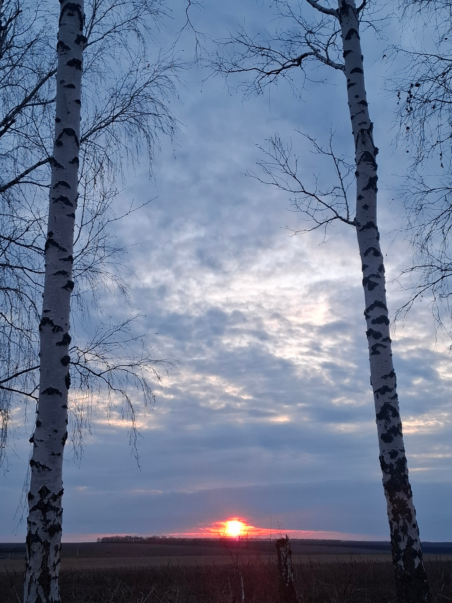 The image depicts a winter sunrise scene near Khlevnoe, Russia. Two birch trees, identifiable by their white bark with black markings and bare branches, frame the view. The sky is a mix of pale blue a…read more