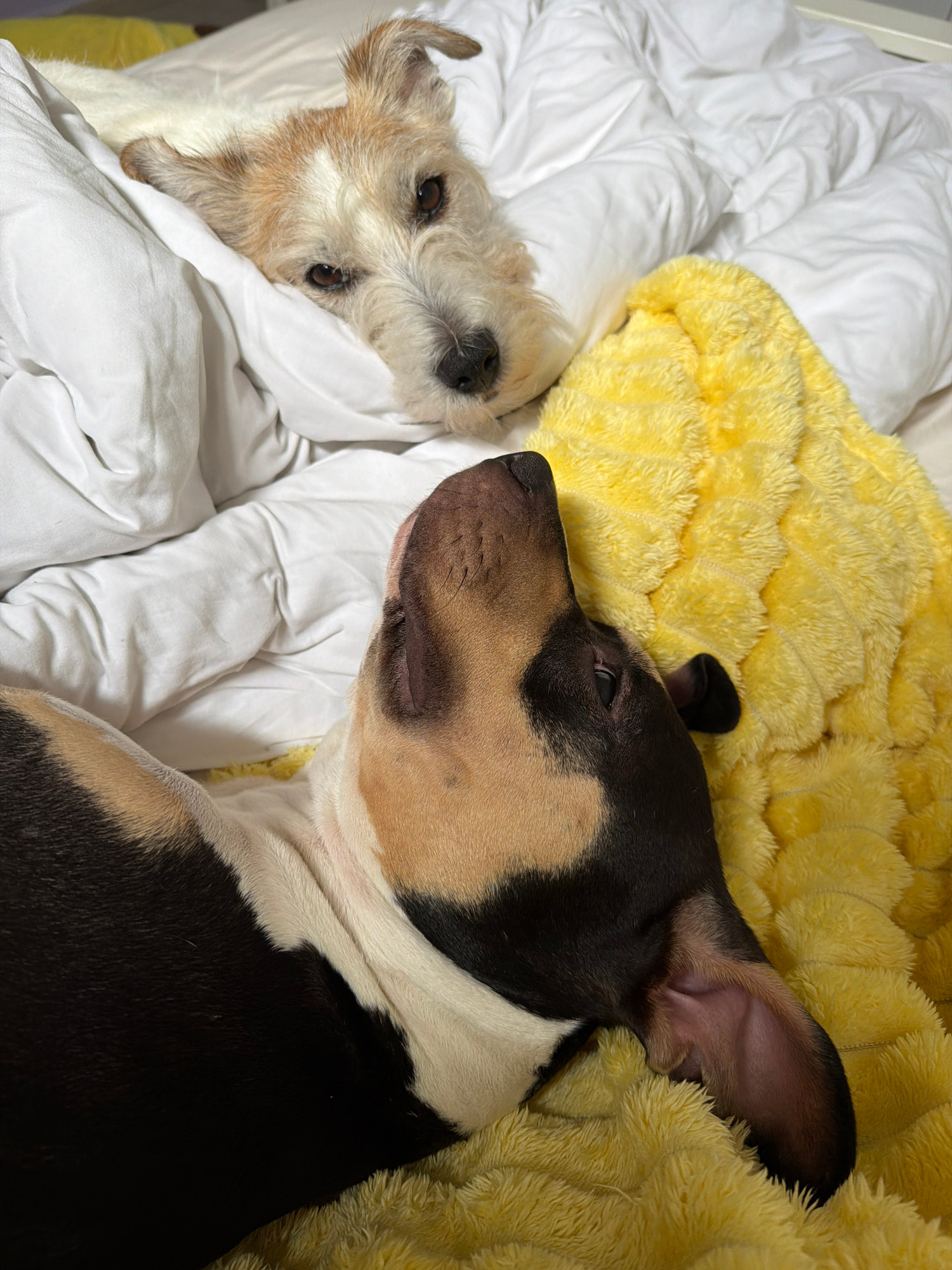 Two dogs rest on a bed covered in white sheets and a yellow, textured blanket. The dog on the right has short, smooth fur that is primarily black with tan and white markings. It is lying with its head…read more